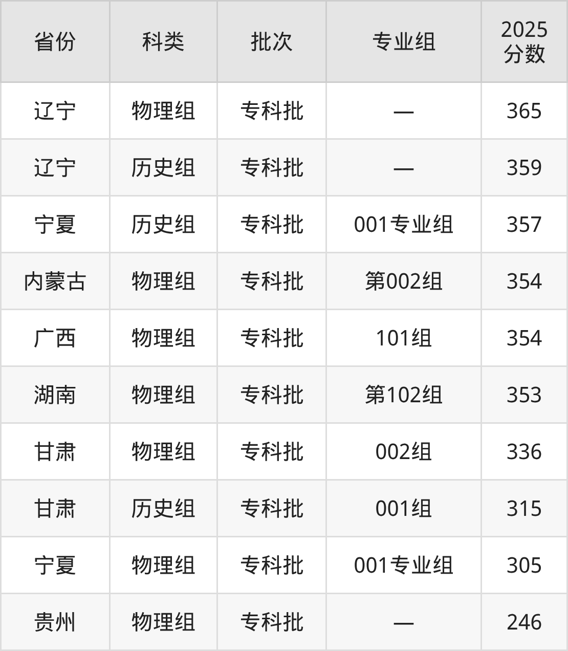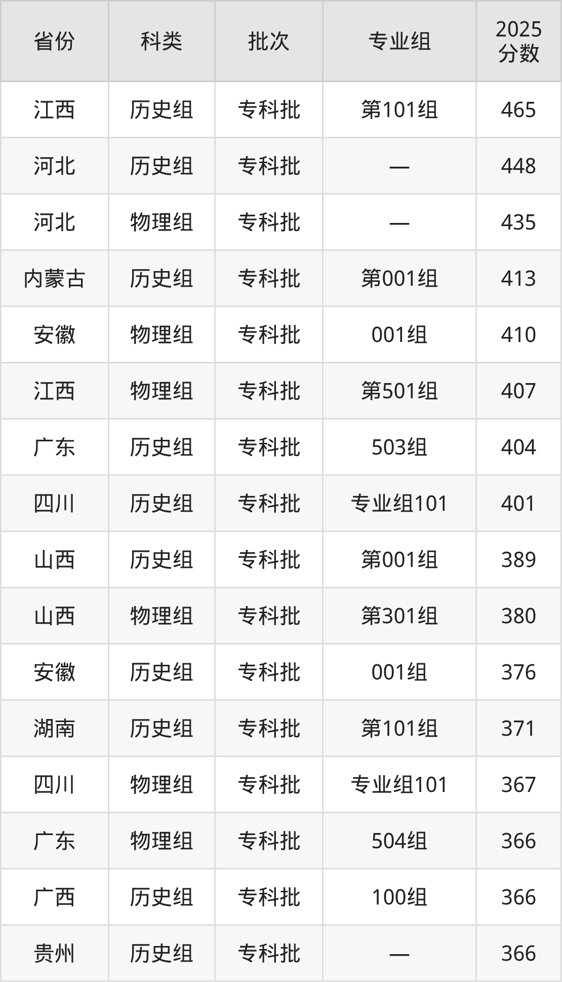 而江西地区历史组考生的分数门槛最高,2025年湖南财经工业职业技术学院第101组在江西招生最低分为465分,考生至少要超专科线175分才有可能被录取。