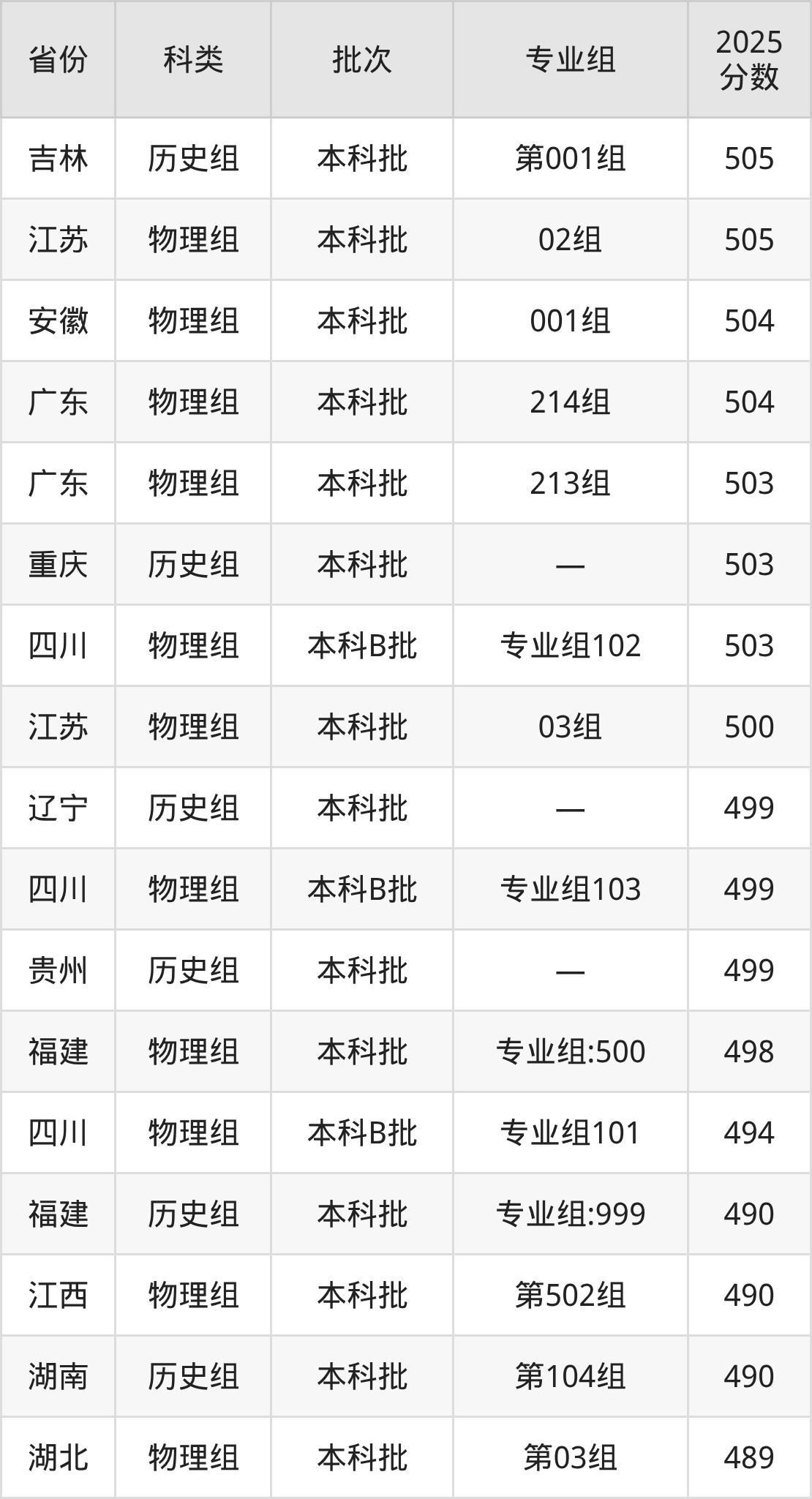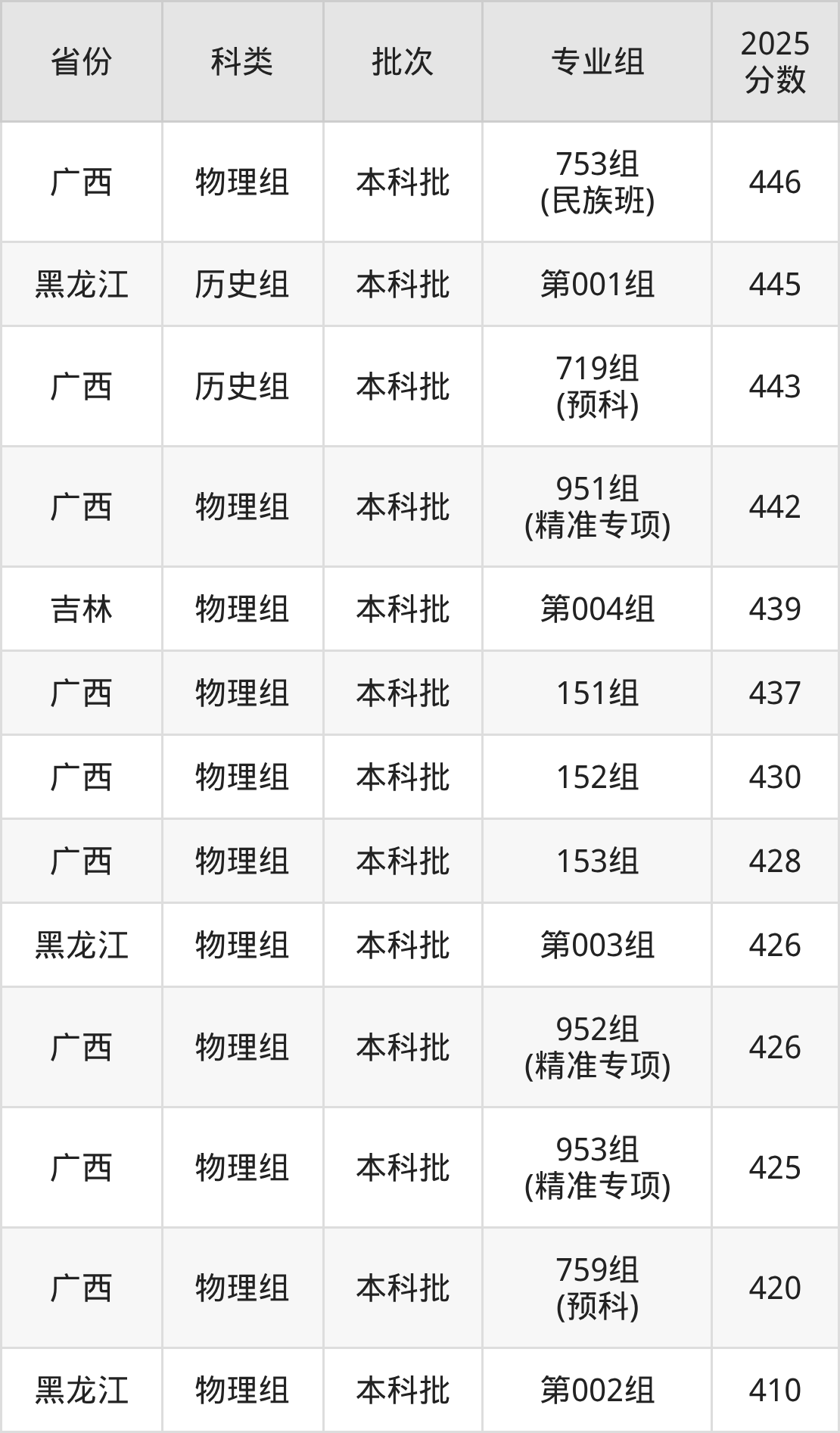2025年广西科技师范学院在全国普通批次招生的录取分数范围位于410~558分之间,其中壮族自治区内分数范围为420分~471分,历史组最低分专业组为“719组(预科)”,考生443分即可报考,物理组最低分专业组为“759组(预科)”,考生420分即可报考。
