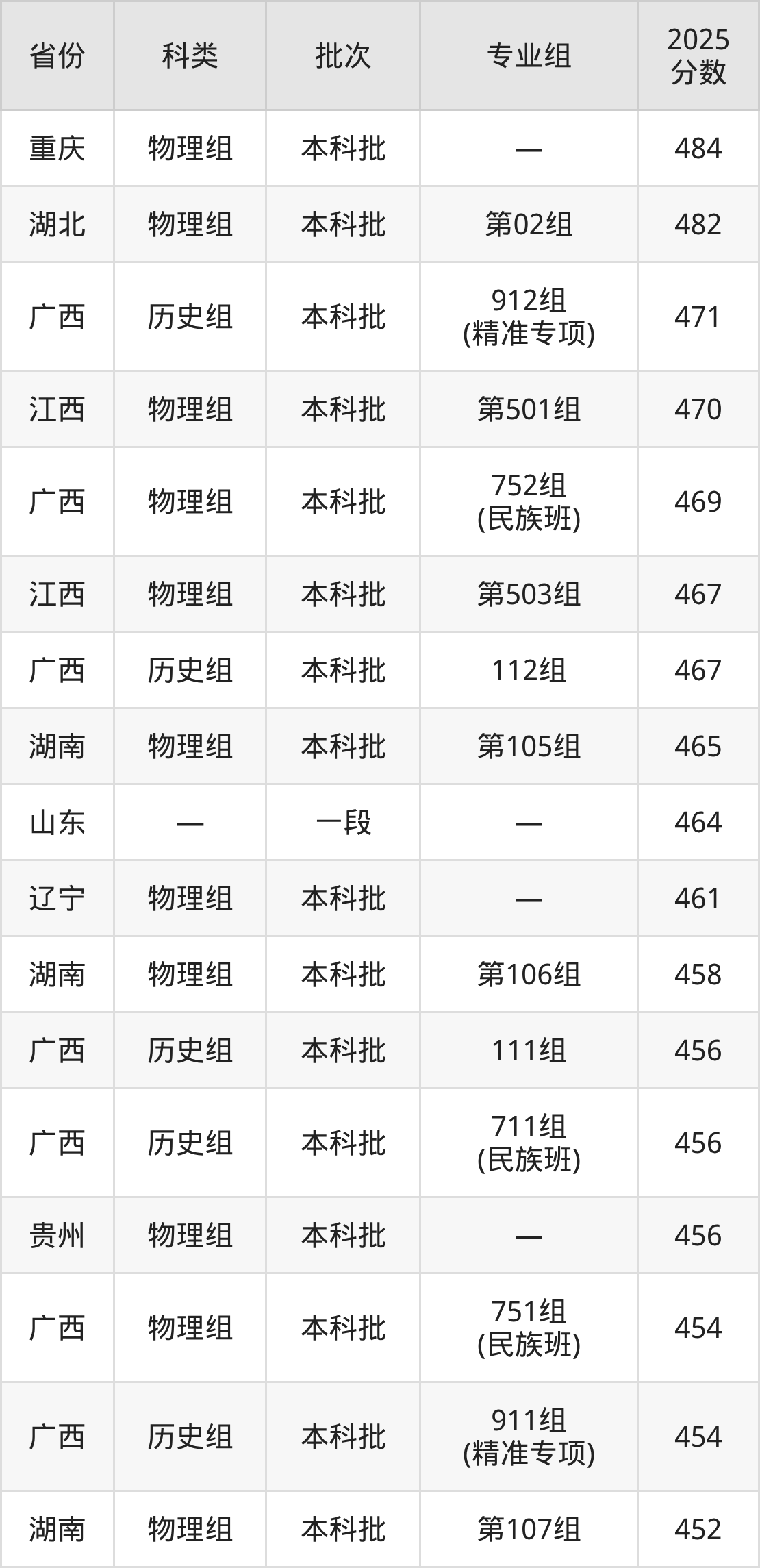 下面是广西科技师范学院2025年在全国各省的录取分数线一览表,供参考: