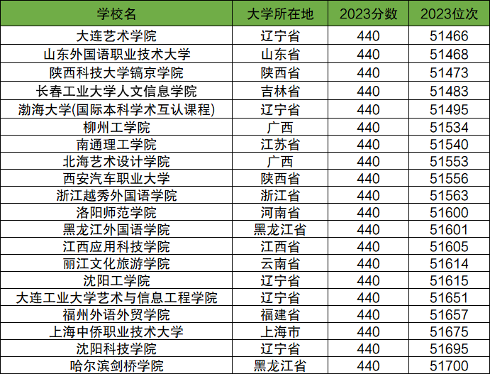 对于安徽文科考生来说,2023年高考分数刚过二本线可以选择柳州工学院、南通理工学院、北海艺术设计学院、西安汽车职业大学等二本大学,以上的院校今年在安徽文科的最低投档分数均为440分,刚好对应了安徽文科的二本批次线。