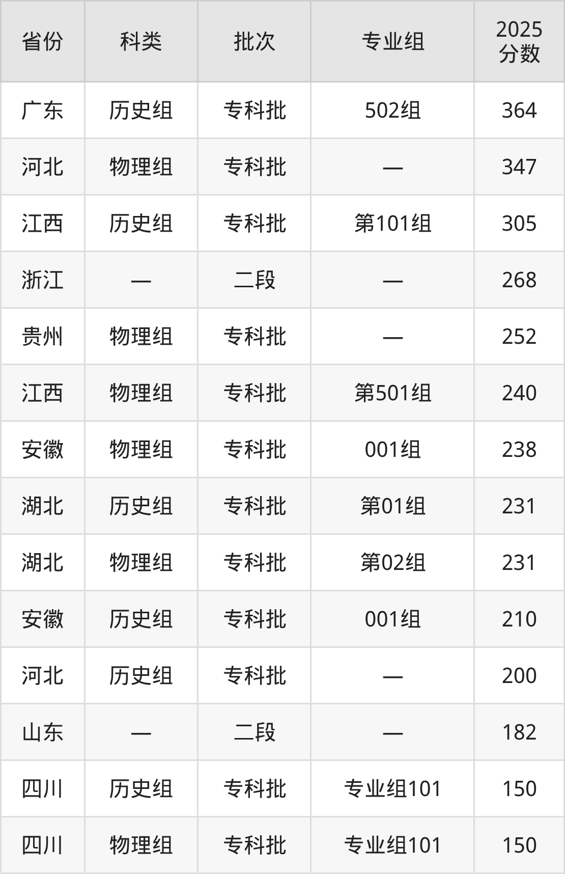 而广东地区历史组考生的分数门槛最高,2025年潇湘职业学院502组在广东招生最低分为364分,考生至少要超专科线149分才有可能被录取。
