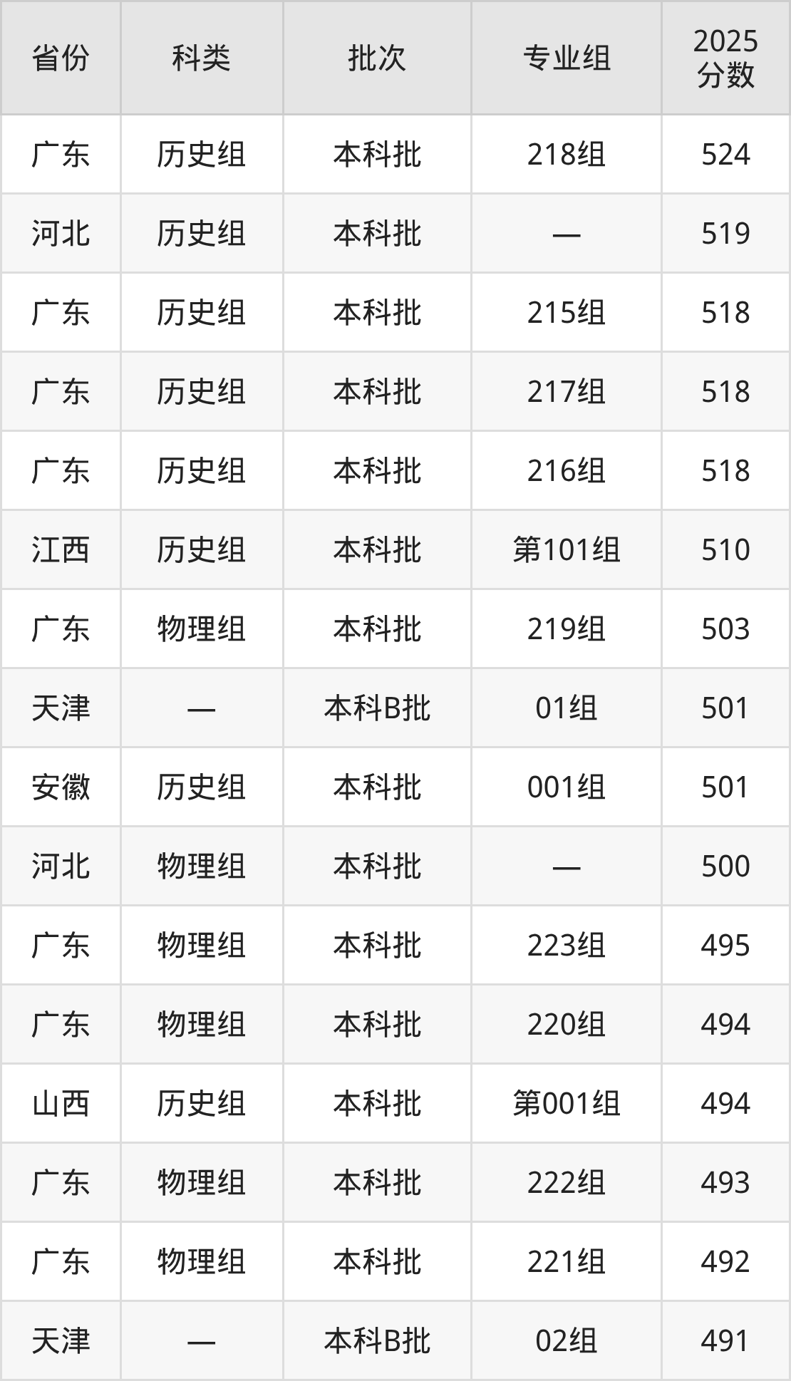 而广东地区历史组考生的分数门槛最高,2025年赣南师范大学科技学院218组在广东招生最低分为524分,考生至少要超本科线60分才有可能被录取。