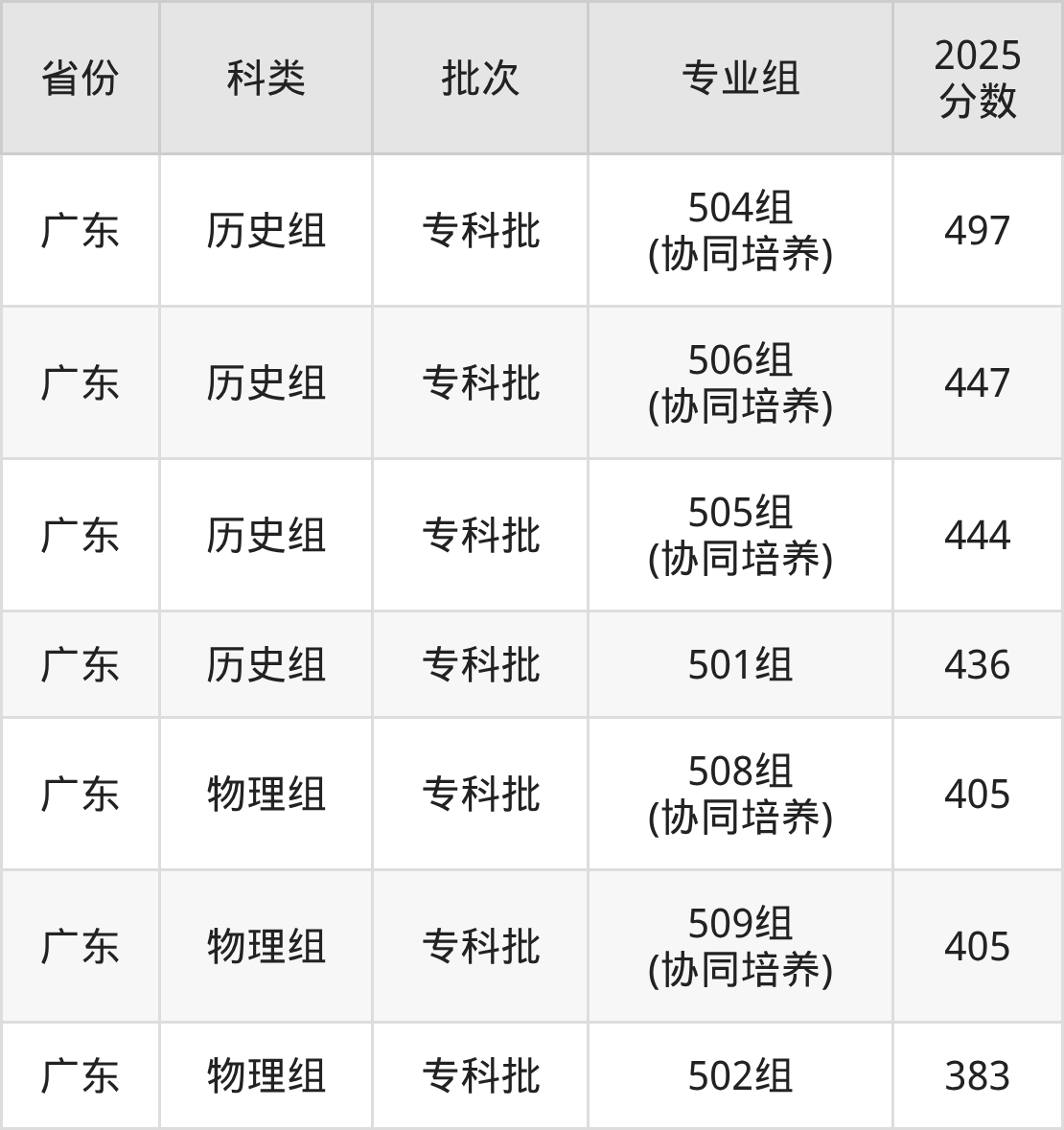 2025年广东行政职业学院在全国普通批次招生的录取分数范围位于383~497分之间,其中省内分数范围为383分~497分,历史组最低分专业组为“501组”,考生436分即可报考,物理组最低分专业组为“502组”,考生383分即可报考。