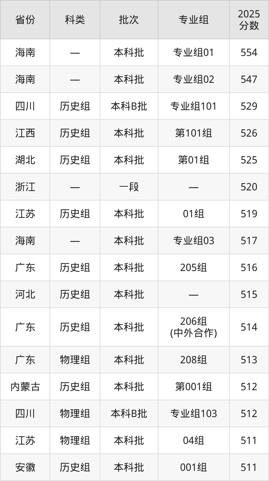 而海南地区考生的分数门槛最高,2025年浙江万里学院专业组01在海南招生最低分为554分,考生至少要超本科线74分才有可能被录取。