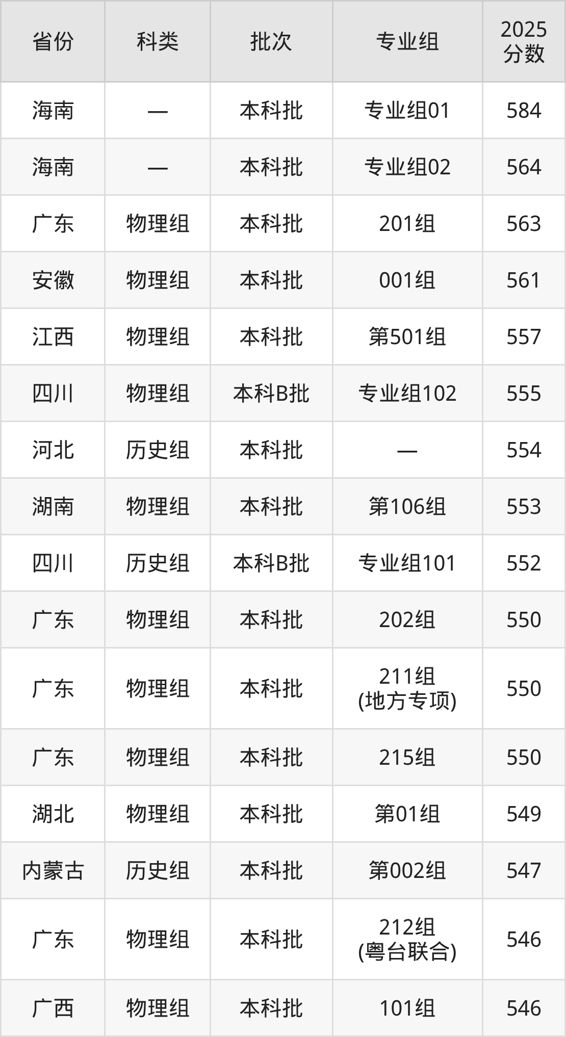 2025年东莞理工学院在全国普通批次招生的录取分数范围位于458~584分之间,其中省内分数范围为526分~563分,物理组最低分专业组为“205组”,考生526分即可报考,历史组最低分专业组为“207组”,考生533分即可报考。