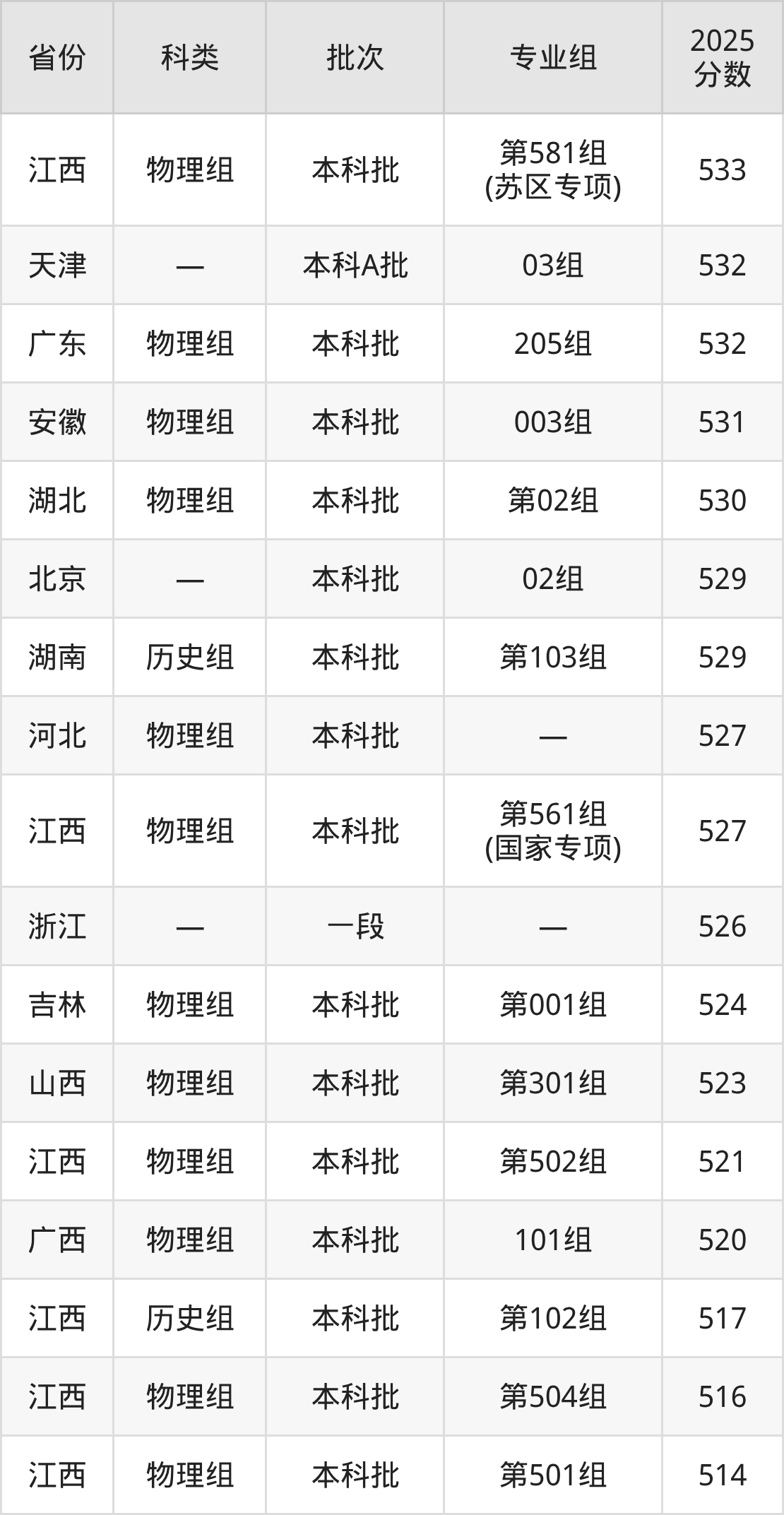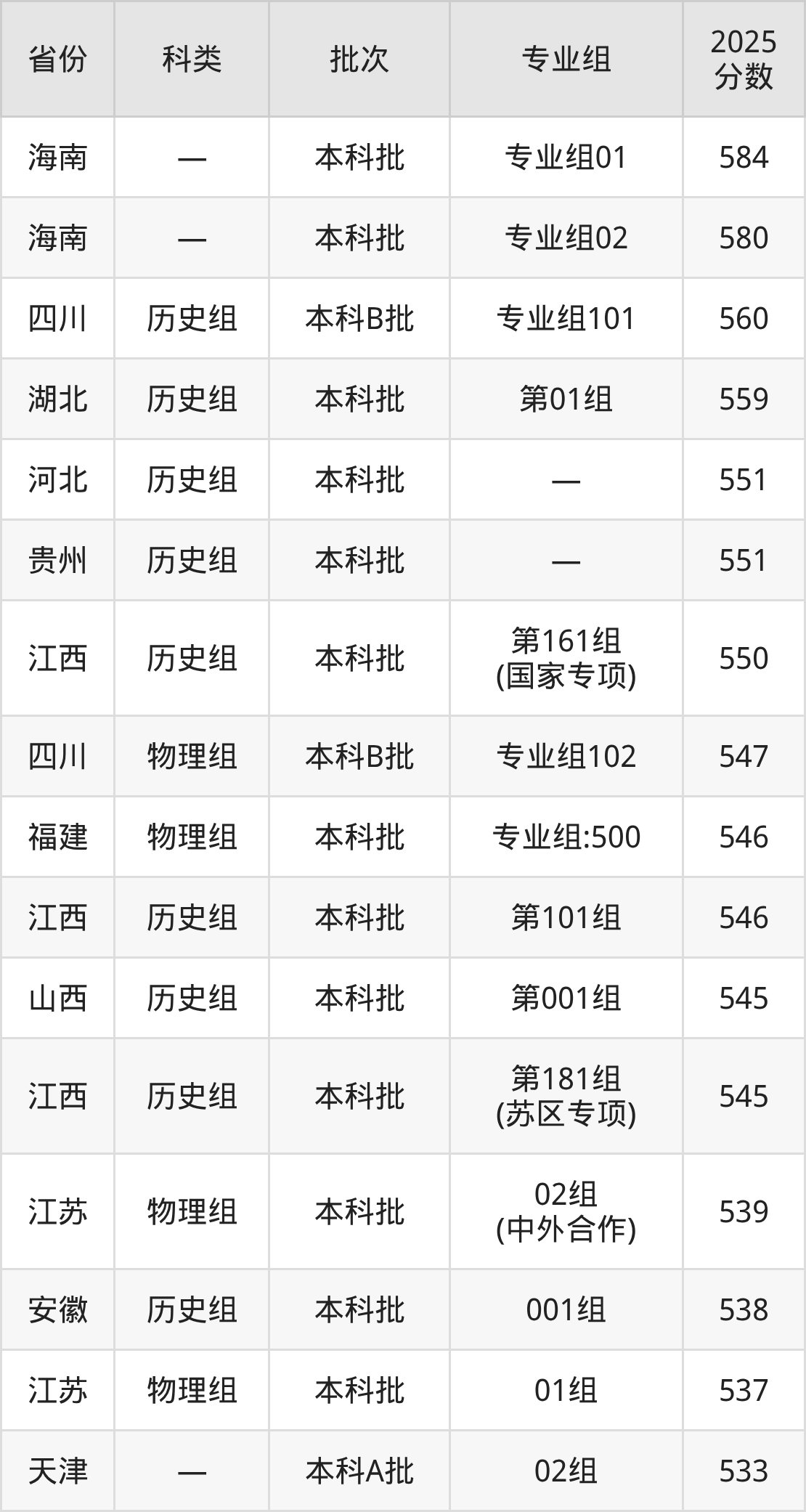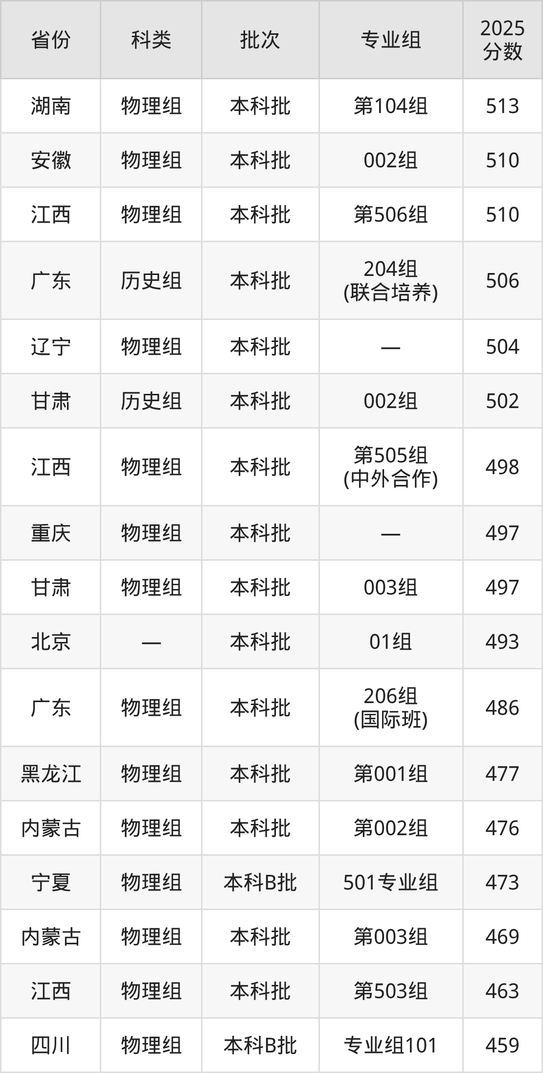 2025年东华理工大学在全国普通批次招生的录取分数范围位于438~584分之间,其中省内分数范围为463分~550分,历史组最低分专业组为“第102组”,考生517分即可报考,物理组最低分专业组为“第503组”,考生463分即可报考。