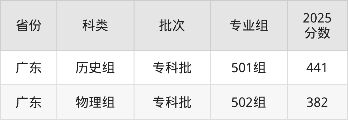 2025年广州体育职业技术学院在全国普通批次招生的录取分数范围位于382~441分之间,其中省内分数范围为382分~441分,历史组最低分专业组为“501组”,考生441分即可报考,物理组最低分专业组为“502组”,考生382分即可报考。