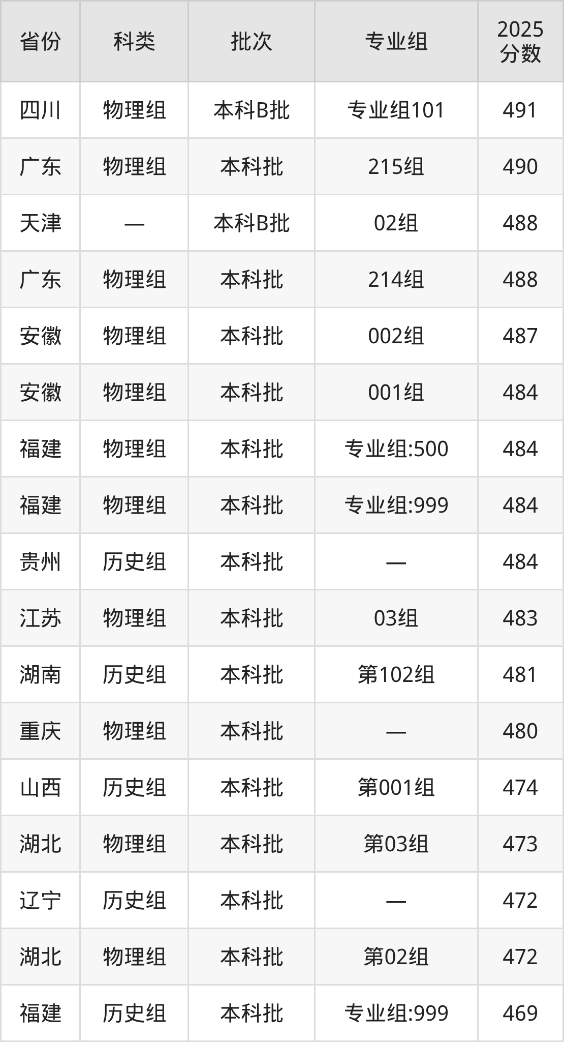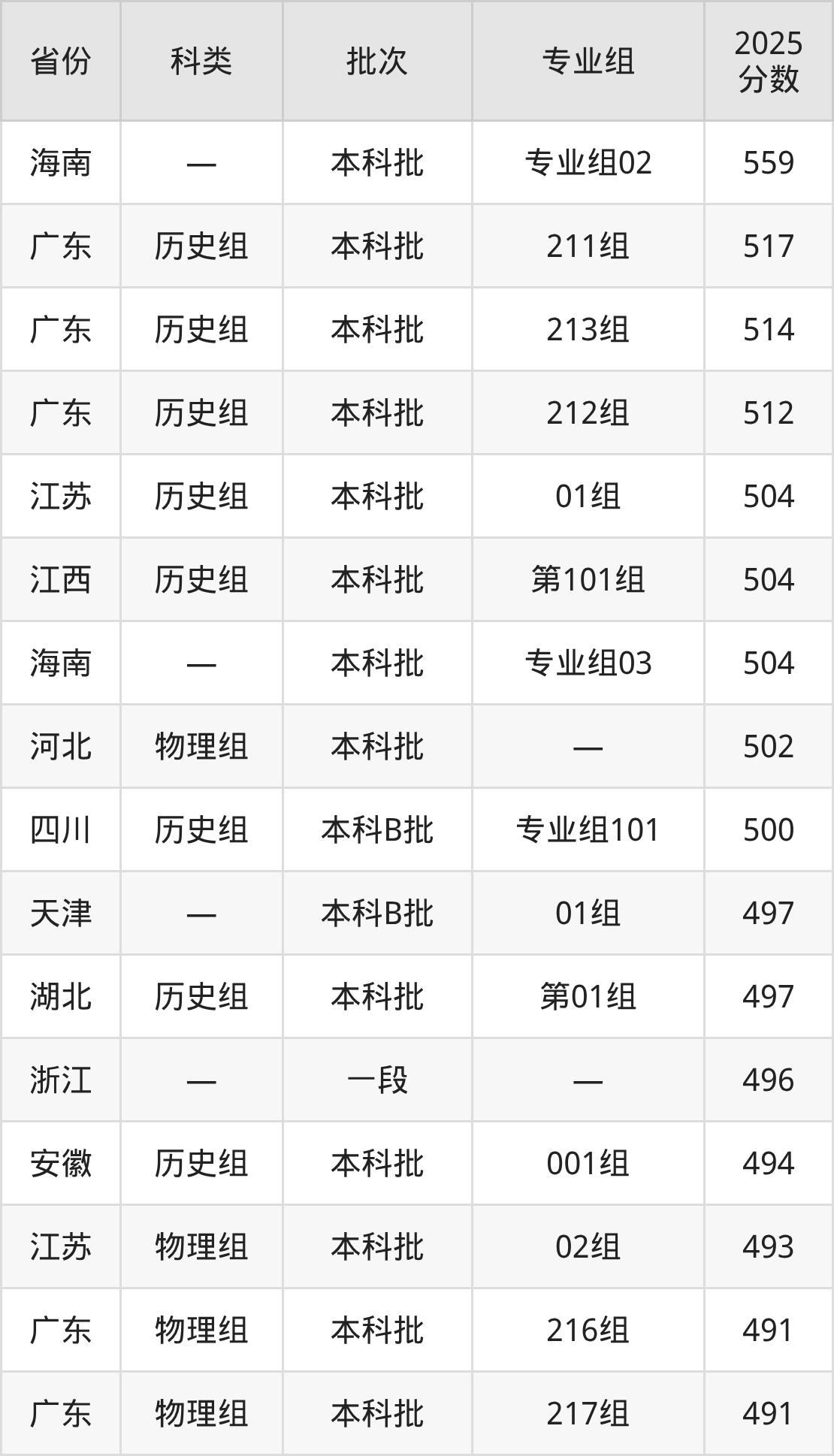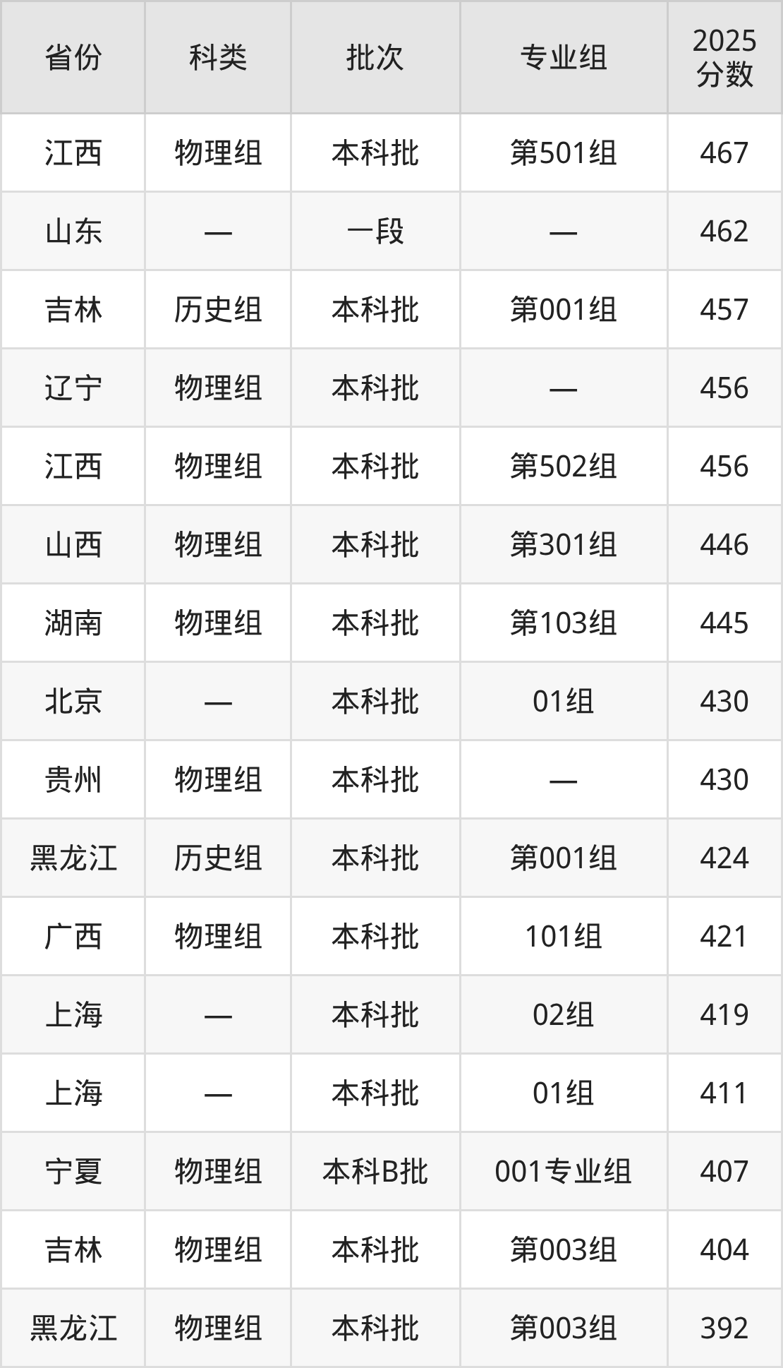 2025年南昌航空大学科技学院在全国普通批次招生的录取分数范围位于392~559分之间,其中省内分数范围为456分~504分,历史组最低分专业组为“第101组”,考生504分即可报考,物理组最低分专业组为“第502组”,考生456分即可报考。
