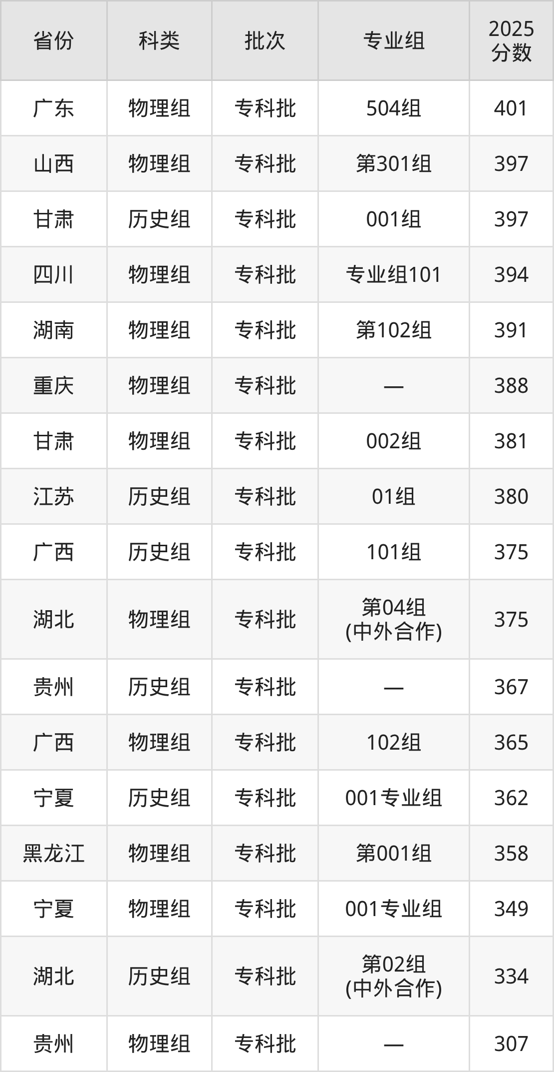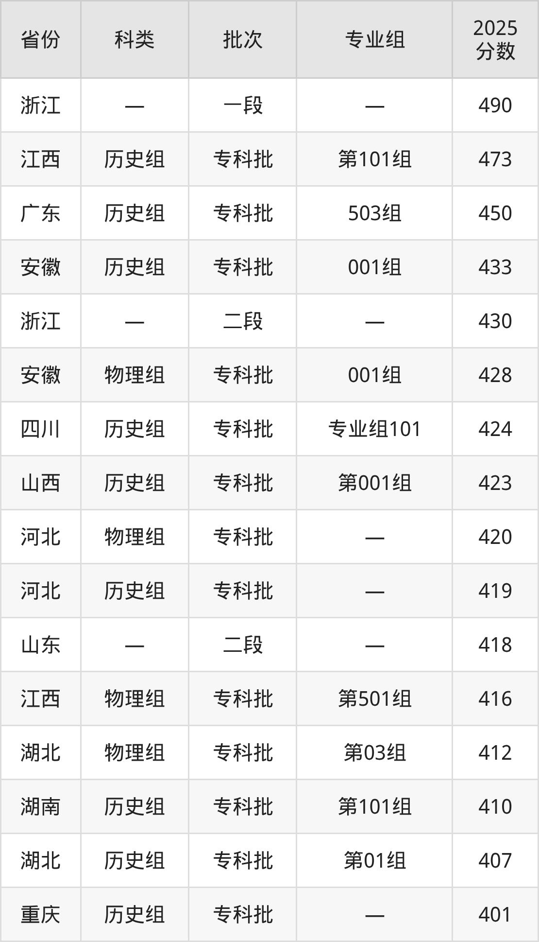 而浙江地区考生的分数门槛最高,2025年武汉铁路桥梁职业学院在浙江招生最低分为490分,考生至少要超一段线0分才有可能被录取。