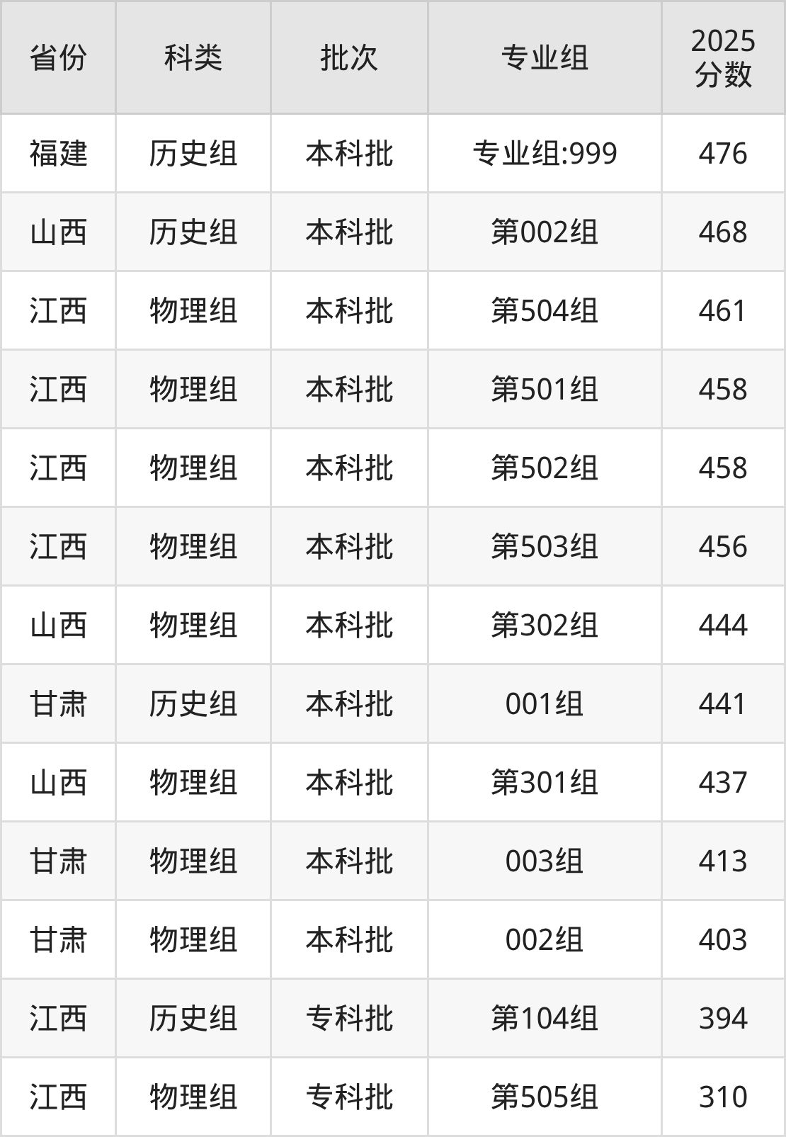 2025年南昌大学共青学院在全国普通批次招生的录取分数范围位于310~550分之间,其中省内分数范围为310分~507分,历史组最低分专业组为“第104组”,考生394分即可报考,物理组最低分专业组为“第505组”,考生310分即可报考。