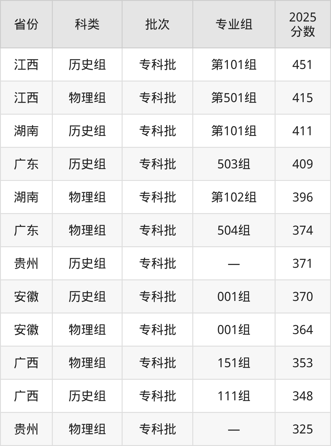 而江西地区历史组考生的分数门槛最高,2025年湖南生物机电职业技术学院第101组在江西招生最低分为451分,考生至少要超专科线161分才有可能被录取。