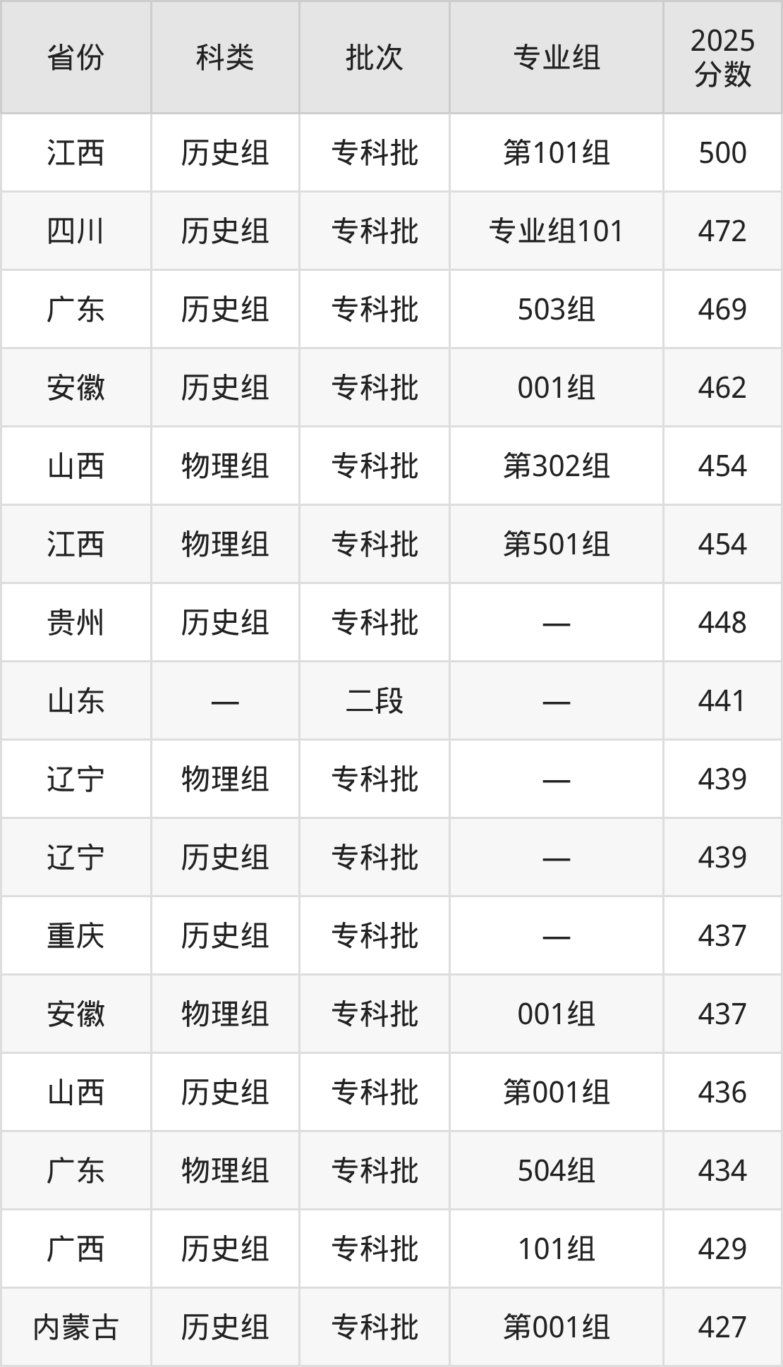 而江西地区历史组考生的分数门槛最高,2025年益阳医学高等专科学校第101组在江西招生最低分为500分,考生至少要超专科线210分才有可能被录取。