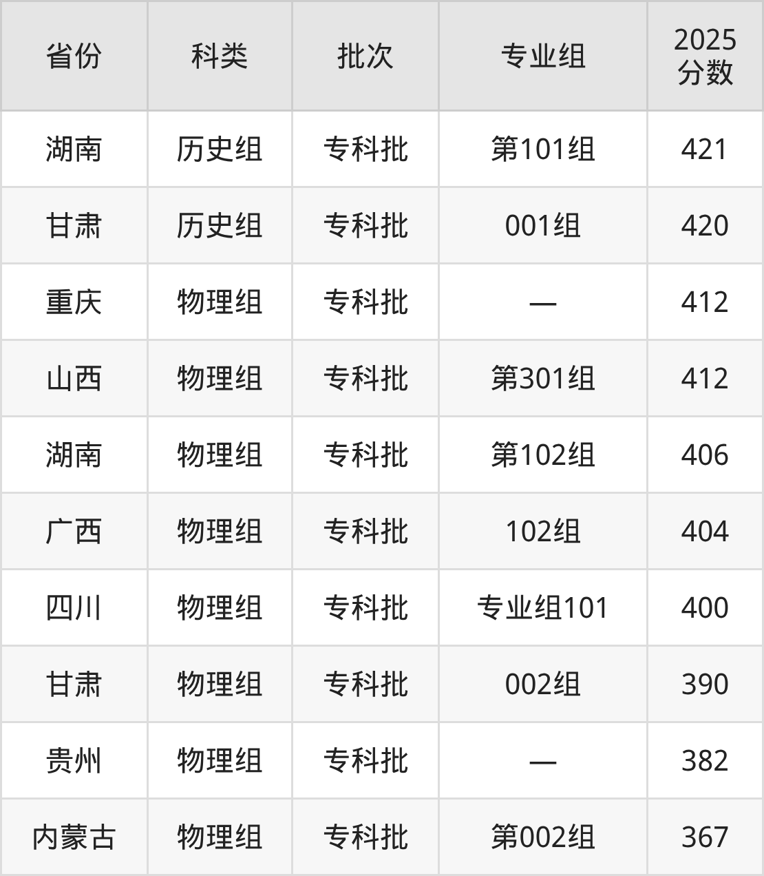 2025年益阳医学高等专科学校在全国普通批次招生的录取分数范围位于367~500分之间,其中省内分数范围为406分~421分,历史组最低分专业组为“第101组”,考生421分即可报考,物理组最低分专业组为“第102组”,考生406分即可报考。