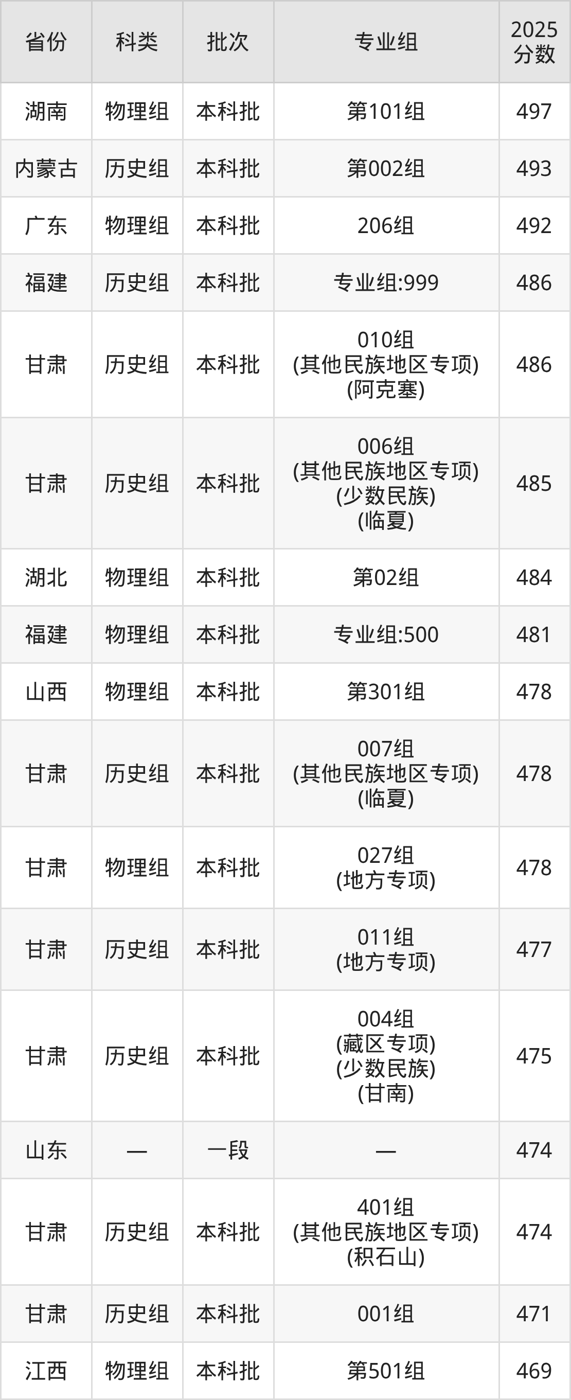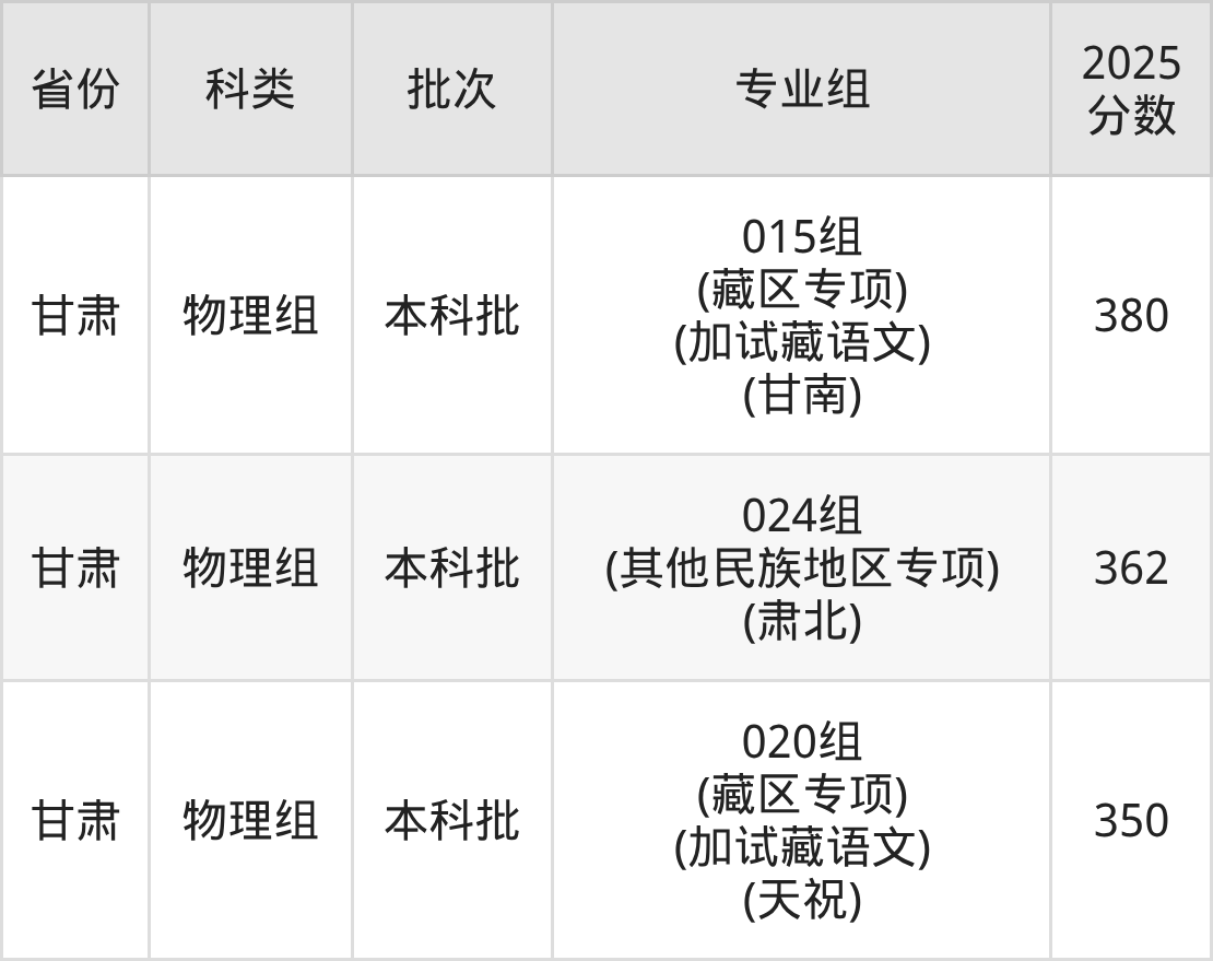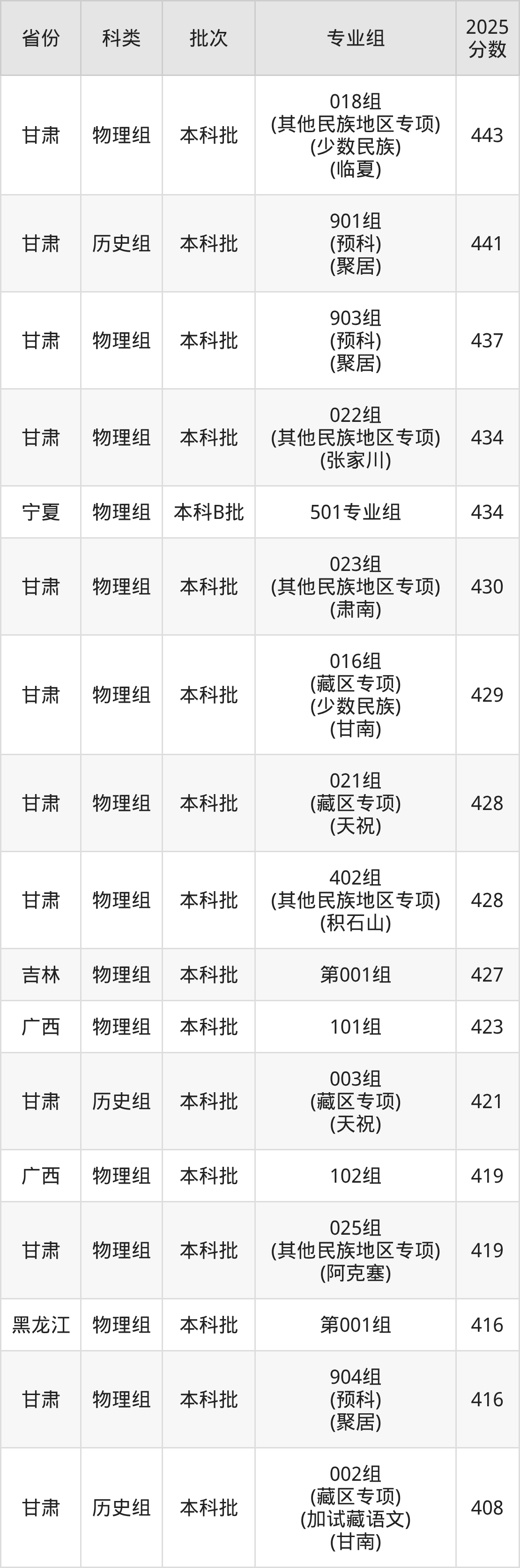 2025年甘肃农业大学在全国普通批次招生的录取分数范围位于350~561分之间,其中省内分数范围为350分~504分,物理组最低分专业组为“020组(藏区专项)(加试藏语文)(天祝)”,考生350分即可报考,历史组最低分专业组为“002组(藏区专项)(加试藏语文)(甘南)”,考生408分即可报考。