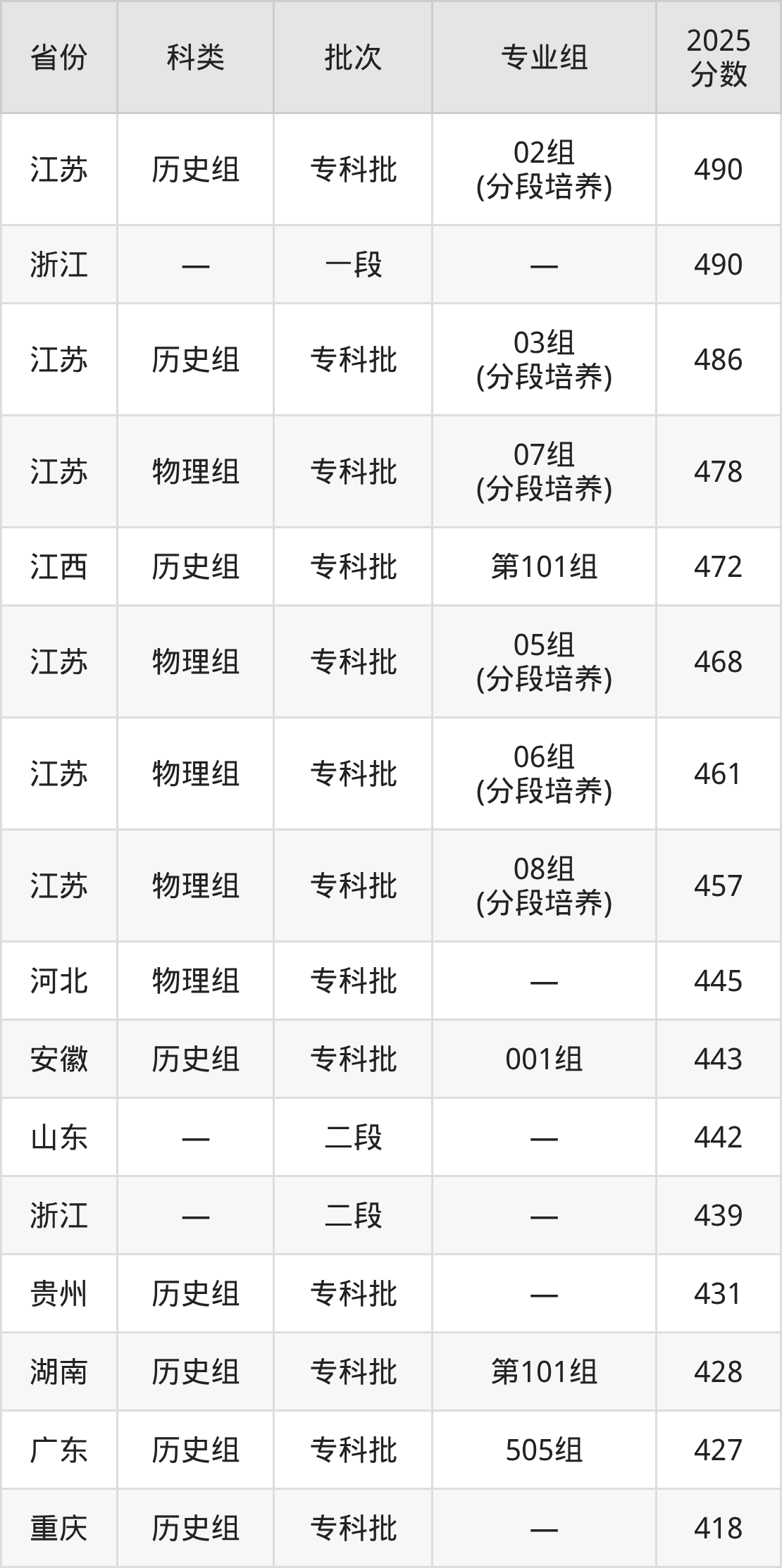 而浙江地区考生的分数门槛最高,2025年南通师范高等专科学校在浙江招生最低分为490分,考生至少要超一段线0分才有可能被录取。