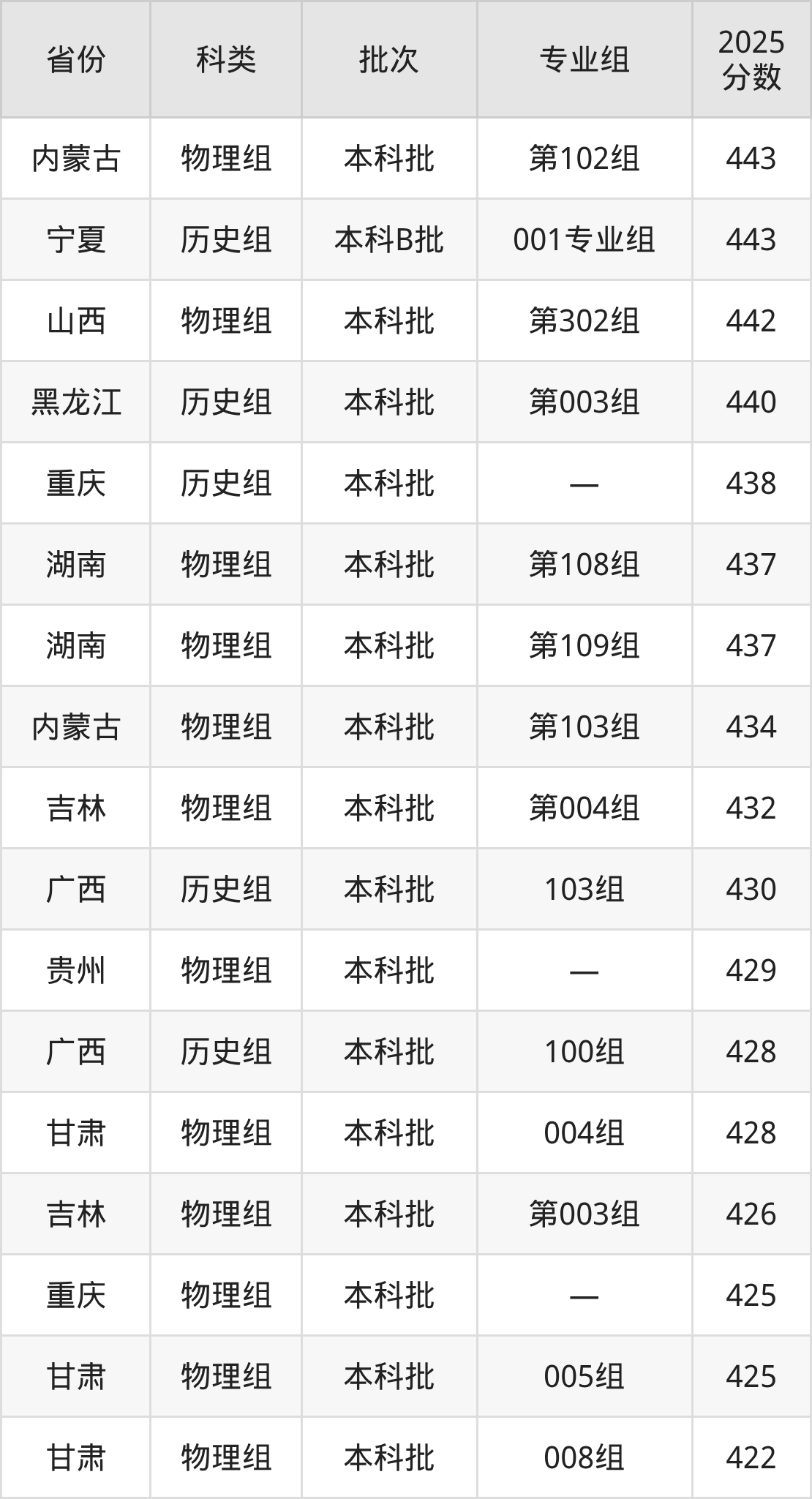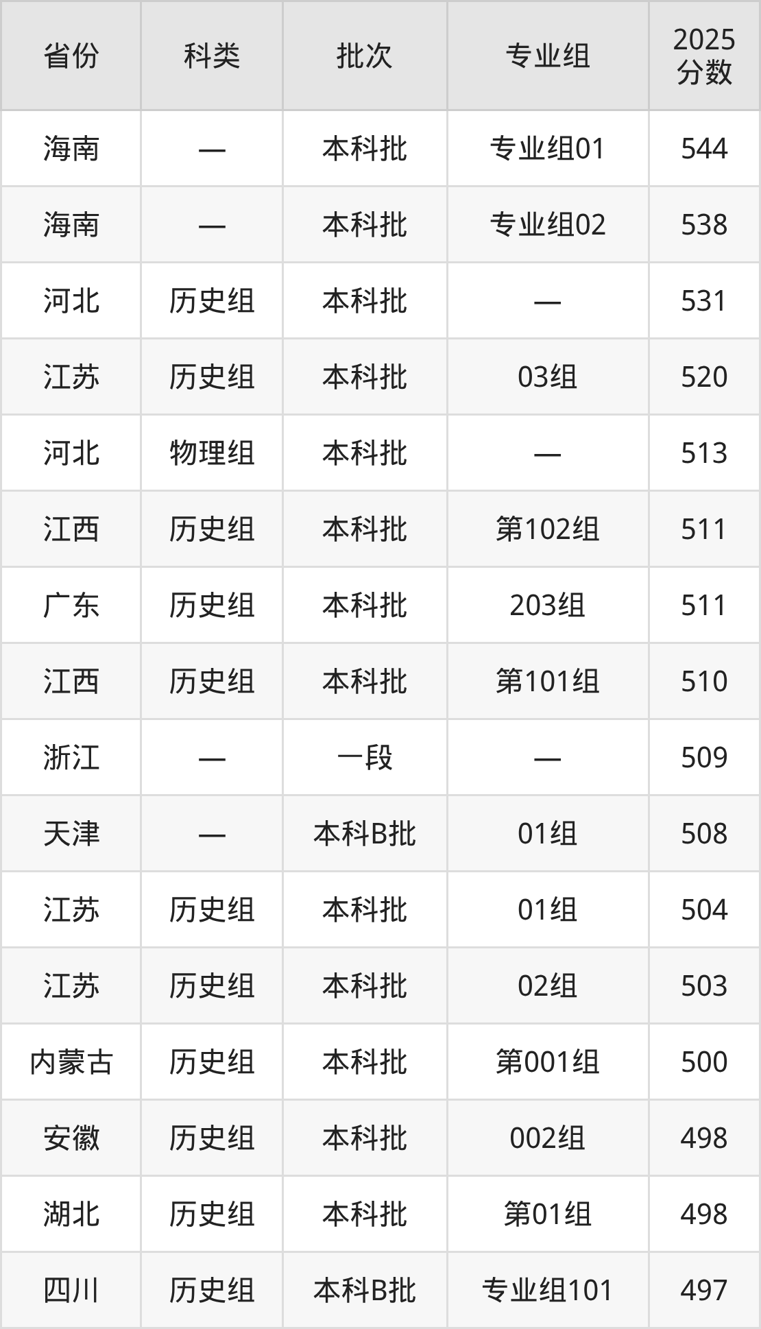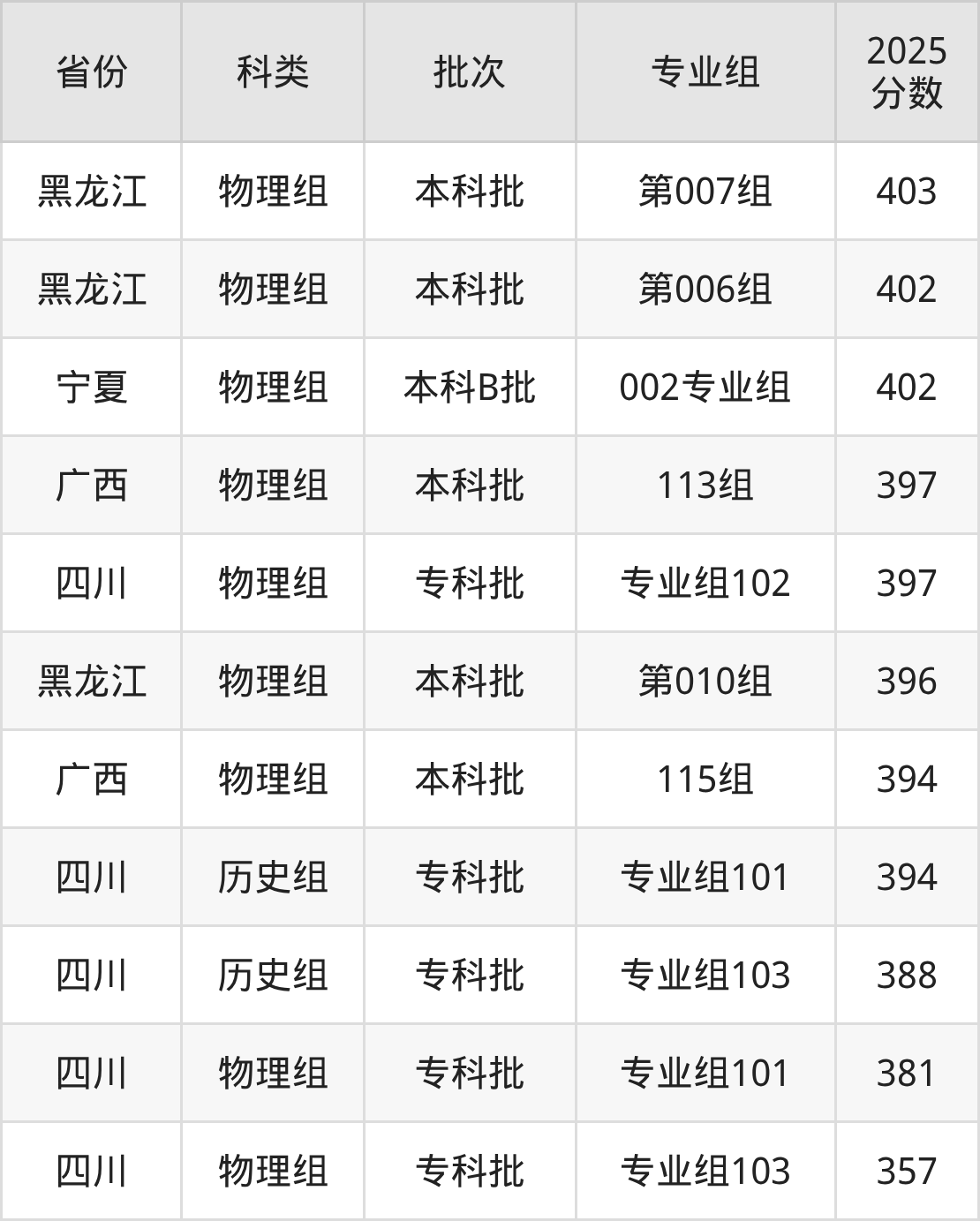 2025年西南财经大学天府学院在全国普通批次招生的录取分数范围位于357~544分之间,其中省内分数范围为357分~497分,历史组最低分专业组为“专业组103”,考生388分即可报考,物理组最低分专业组为“专业组103”,考生357分即可报考。