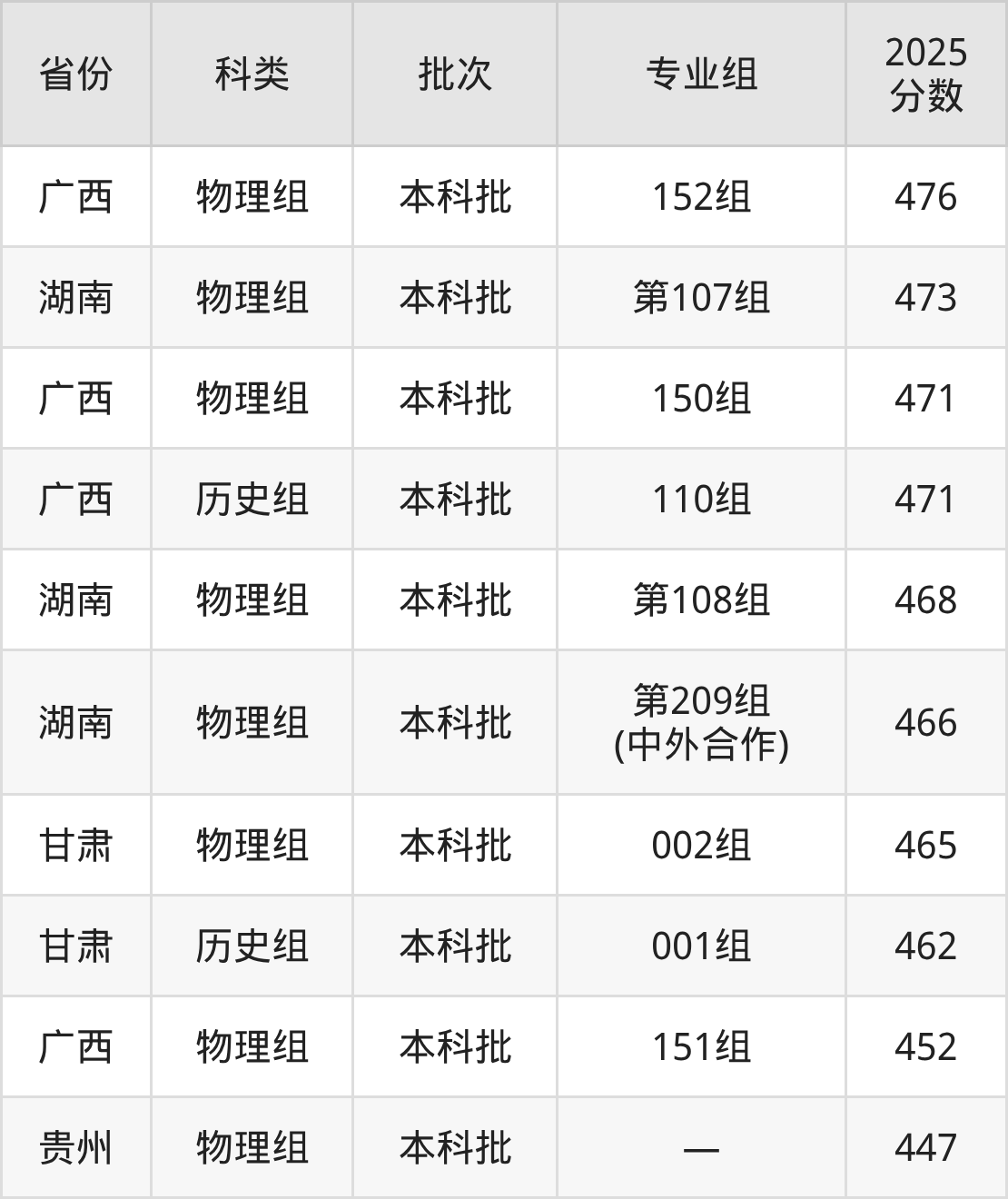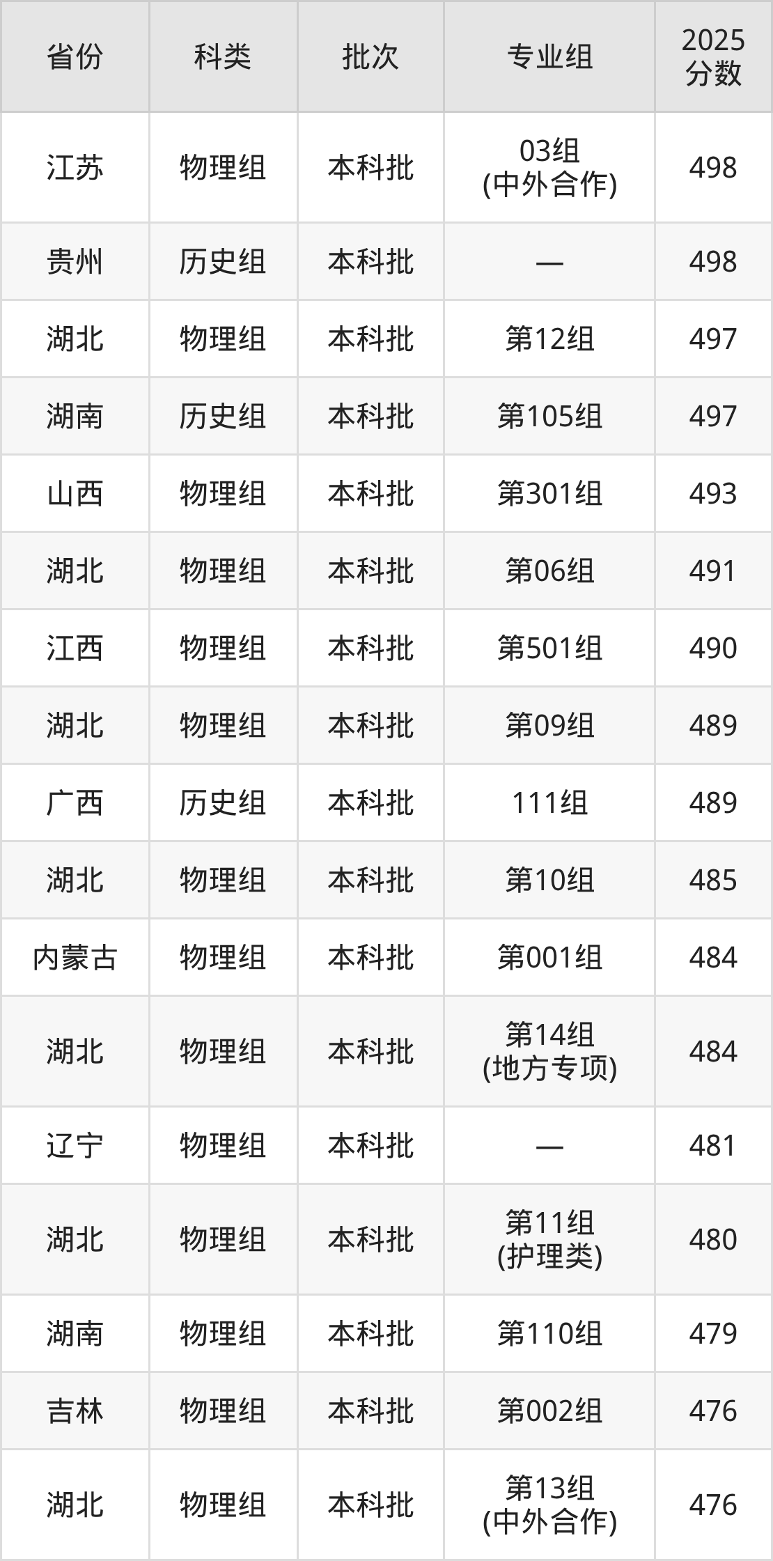 2025年湖北科技学院在全国普通批次招生的录取分数范围位于447~575分之间,其中省内分数范围为476分~524分,物理组最低分专业组为“第13组(中外合作)”,考生476分即可报考,历史组最低分专业组为“第03组”,考生509分即可报考。
