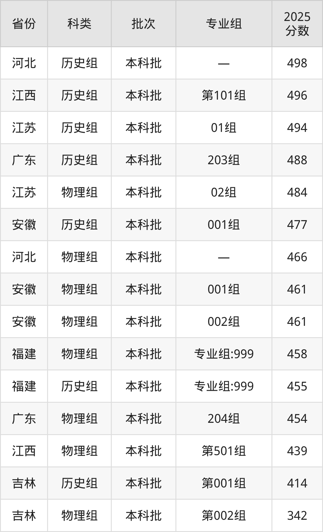 2025年安徽外国语学院在全国普通批次招生的录取分数范围位于342~498分之间,其中省内分数范围为461分~477分,历史组最低分专业组为“001组”,考生477分即可报考,物理组最低分专业组为“001组”,考生461分即可报考。
