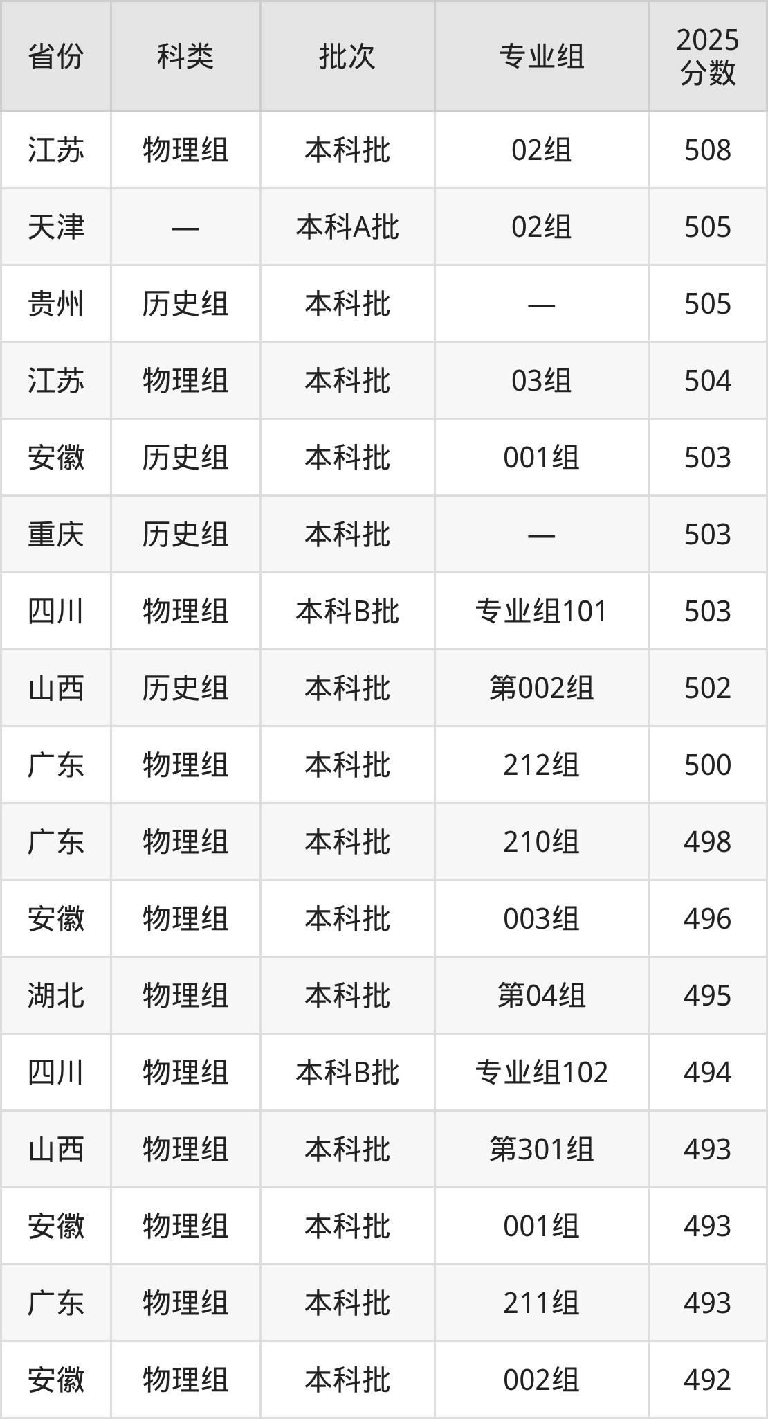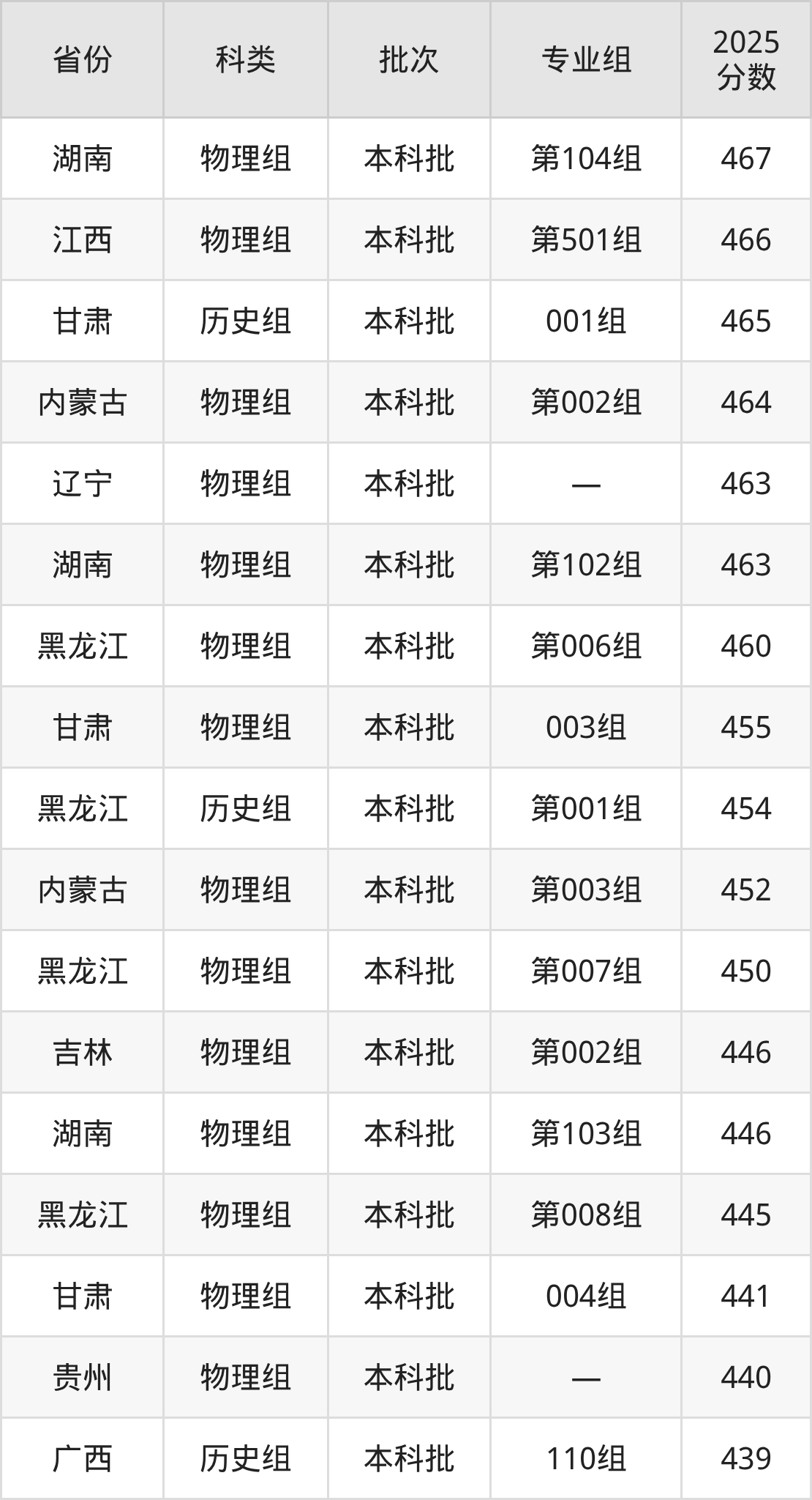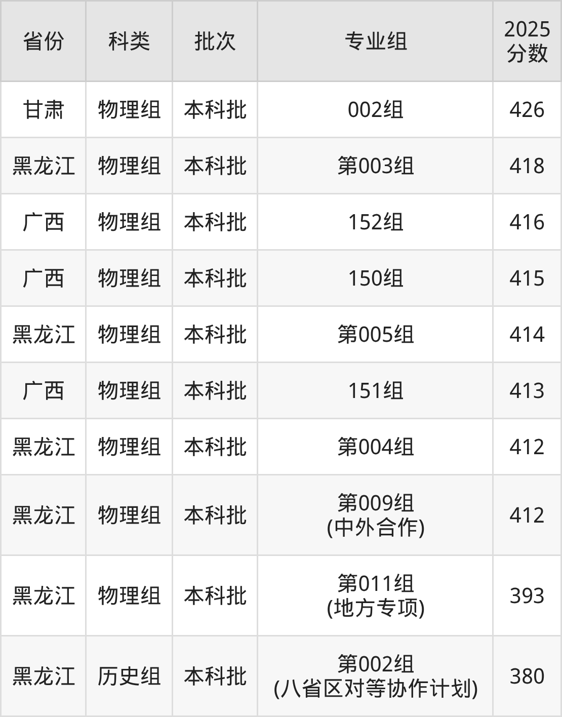 2025年黑龙江工程学院在全国普通批次招生的录取分数范围位于380~552分之间,其中省内分数范围为380分~544分,物理组最低分专业组为“第011组(地方专项)”,考生393分即可报考,历史组最低分专业组为“第002组(八省区对等协作计划)”,考生380分即可报考。