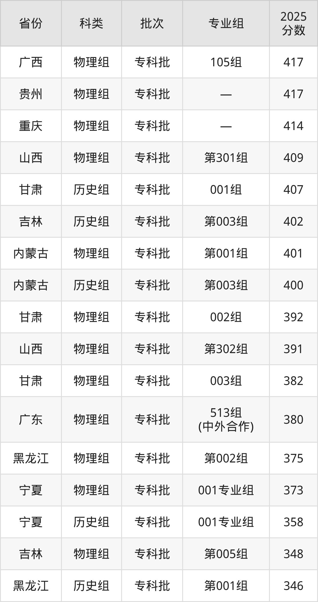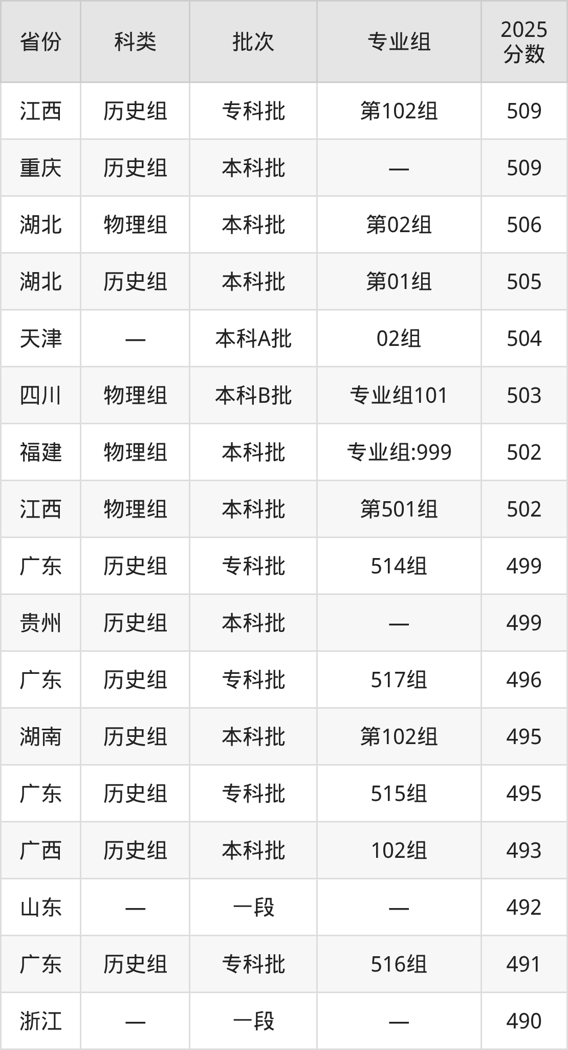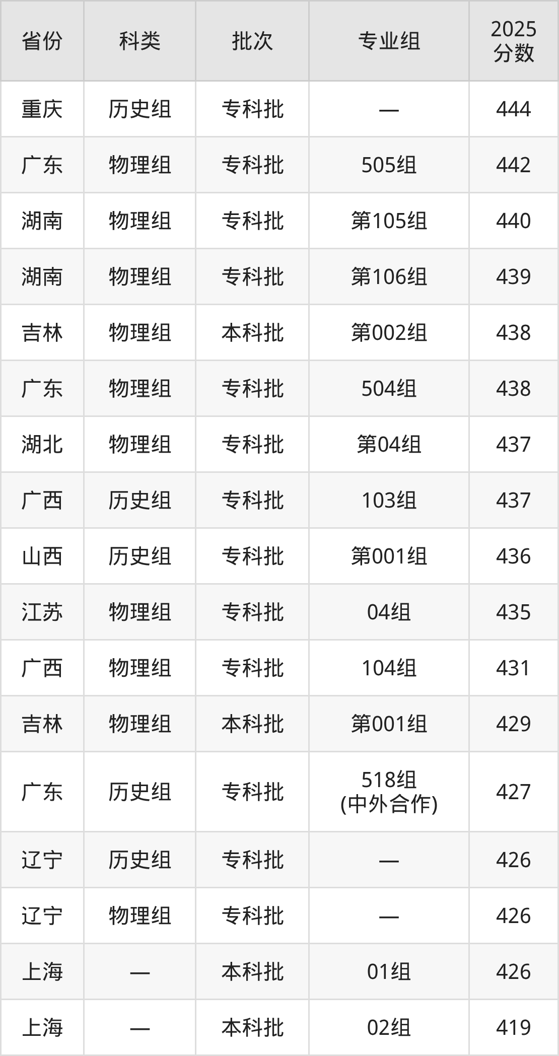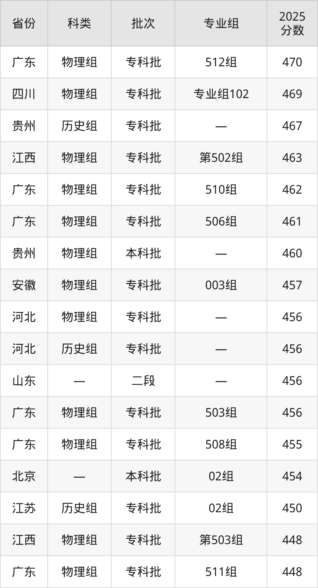 下面是广东轻工职业技术大学2025年在全国各省的录取分数线一览表,供参考: