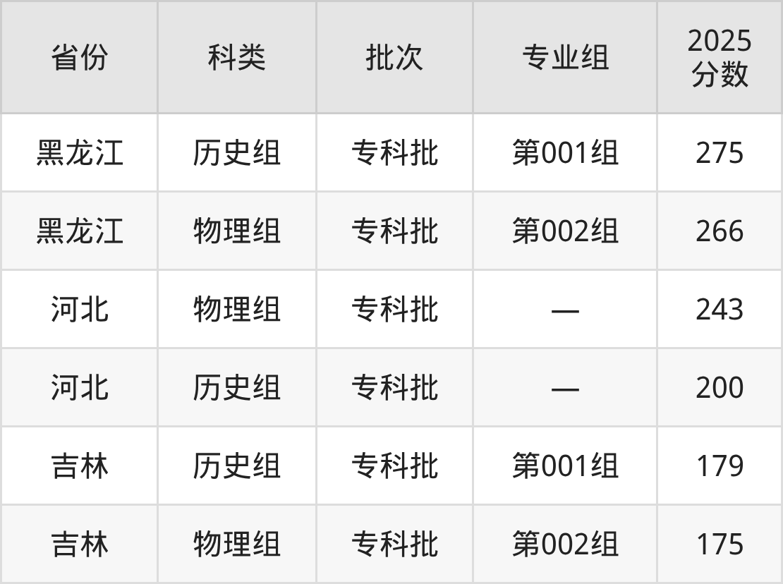 而黑龙江地区历史组考生的分数门槛最高,2025年吉林城市职业技术学院第001组在黑龙江招生最低分为275分,考生至少要超专科线115分才有可能被录取。