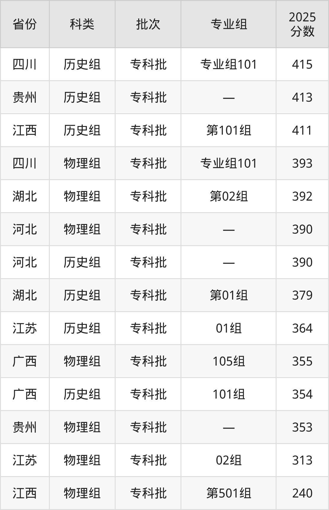 而四川地区历史组考生的分数门槛最高,2025年江西农业工程职业学院专业组101在四川招生最低分为415分,考生至少要超专科线265分才有可能被录取。