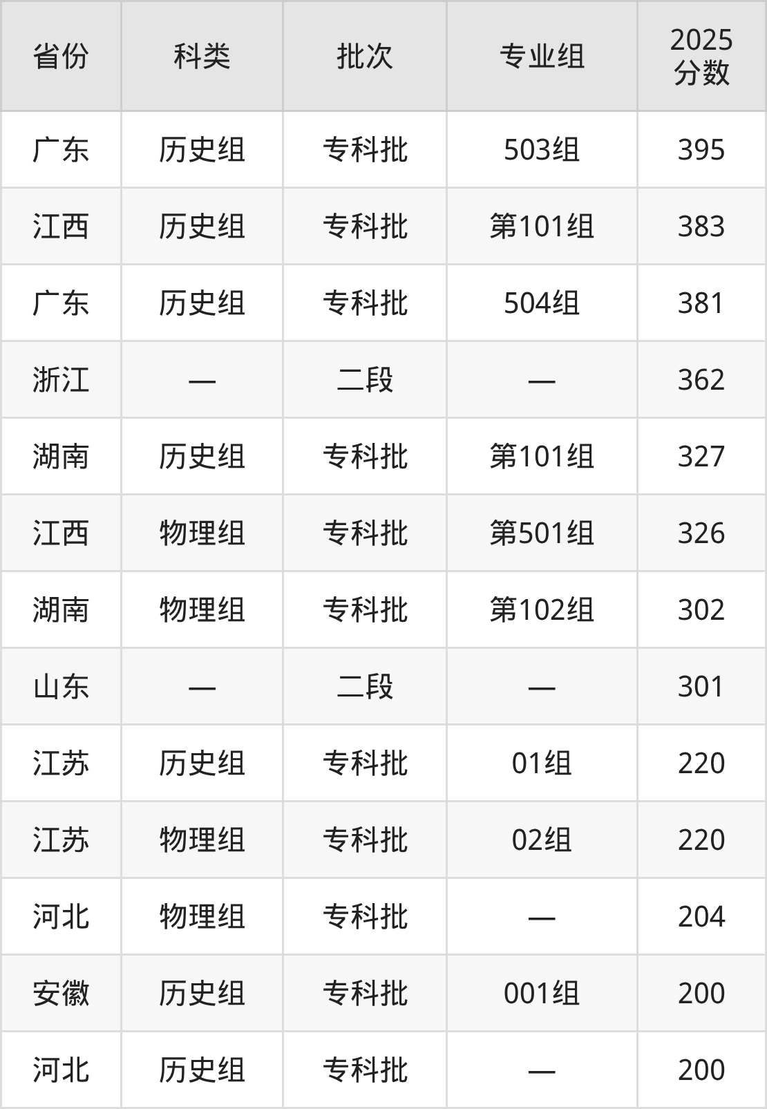 而广东地区历史组考生的分数门槛最高,2025年南京视觉艺术职业学院503组在广东招生最低分为395分,考生至少要超专科线180分才有可能被录取。