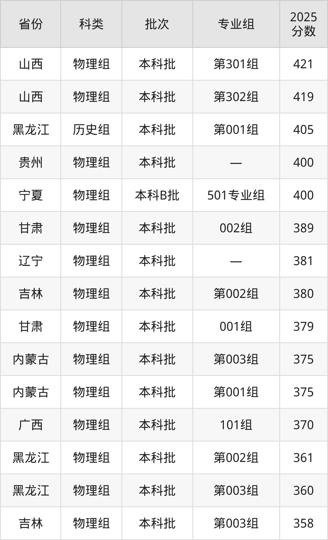 长春电子科技学院在省外招生的最低分为360分,其中黑龙江地区物理组考生上长春电子科技学院的分数门槛最低,考生成绩达本科线即可报考。其次是广西物理组考生,上长春电子科技学院至少要超本科线0分(370分)。