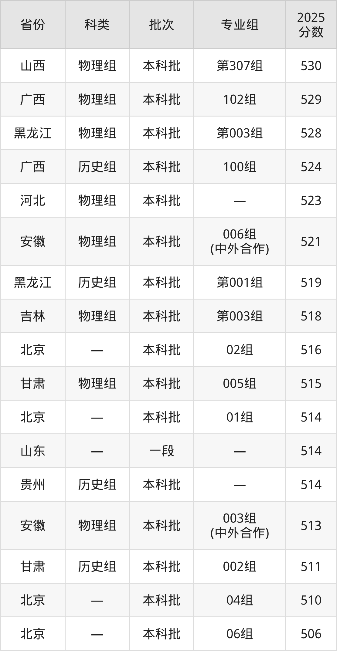 而内蒙古地区历史组考生的分数门槛最高,2025年北京联合大学第004组在内蒙古招生最低分为594分,考生至少要超本科线176分才有可能被录取。