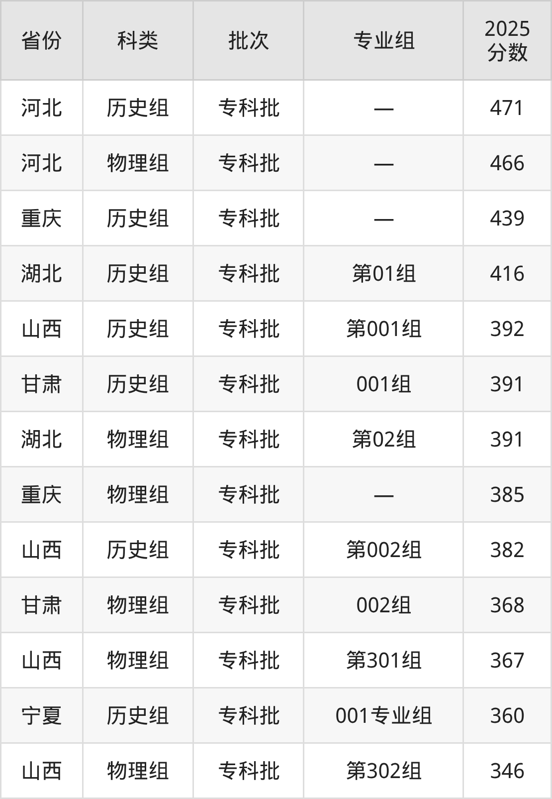 2025年山西卫生健康职业学院在全国普通批次招生的录取分数范围位于346~471分之间,其中省内分数范围为346分~392分,历史组最低分专业组为“第002组”,考生382分即可报考,物理组最低分专业组为“第302组”,考生346分即可报考。