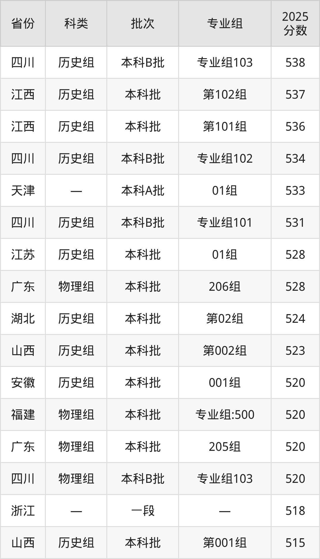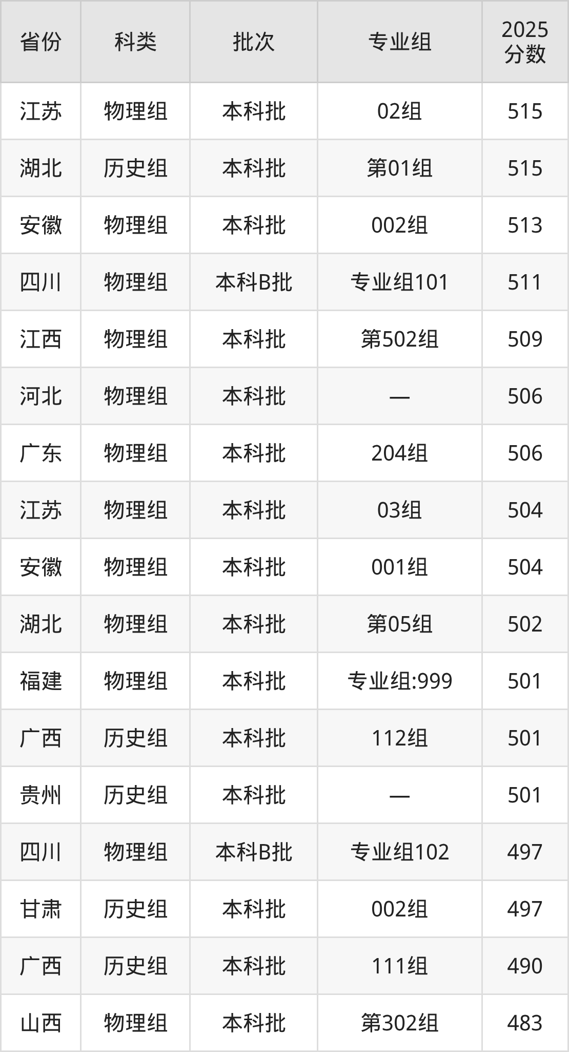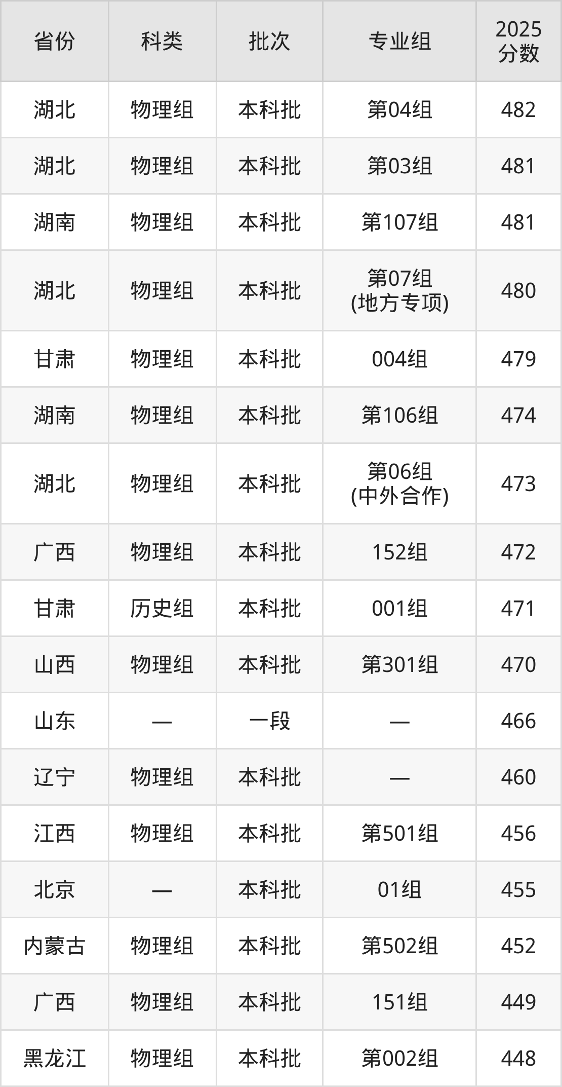 2025年湖北工程学院在全国普通批次招生的录取分数范围位于413~538分之间,其中省内分数范围为473分~524分,历史组最低分专业组为“第01组”,考生515分即可报考,物理组最低分专业组为“第06组(中外合作)”,考生473分即可报考。