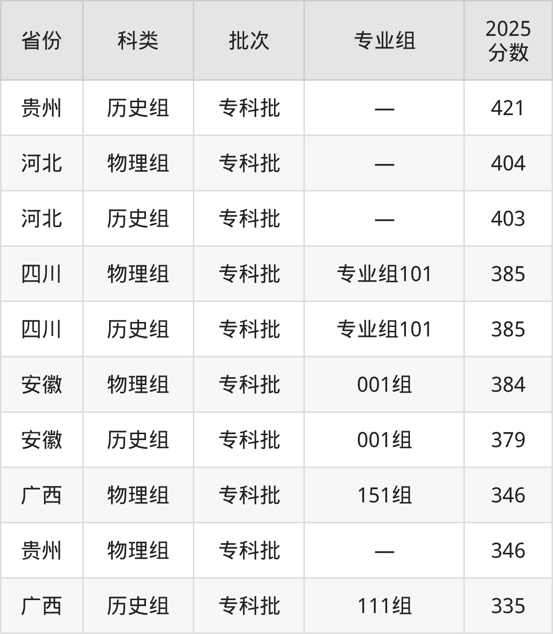 而贵州地区历史组考生的分数门槛最高,2025年安徽电子信息职业技术学院在贵州招生最低分为421分,考生至少要超专科线241分才有可能被录取。