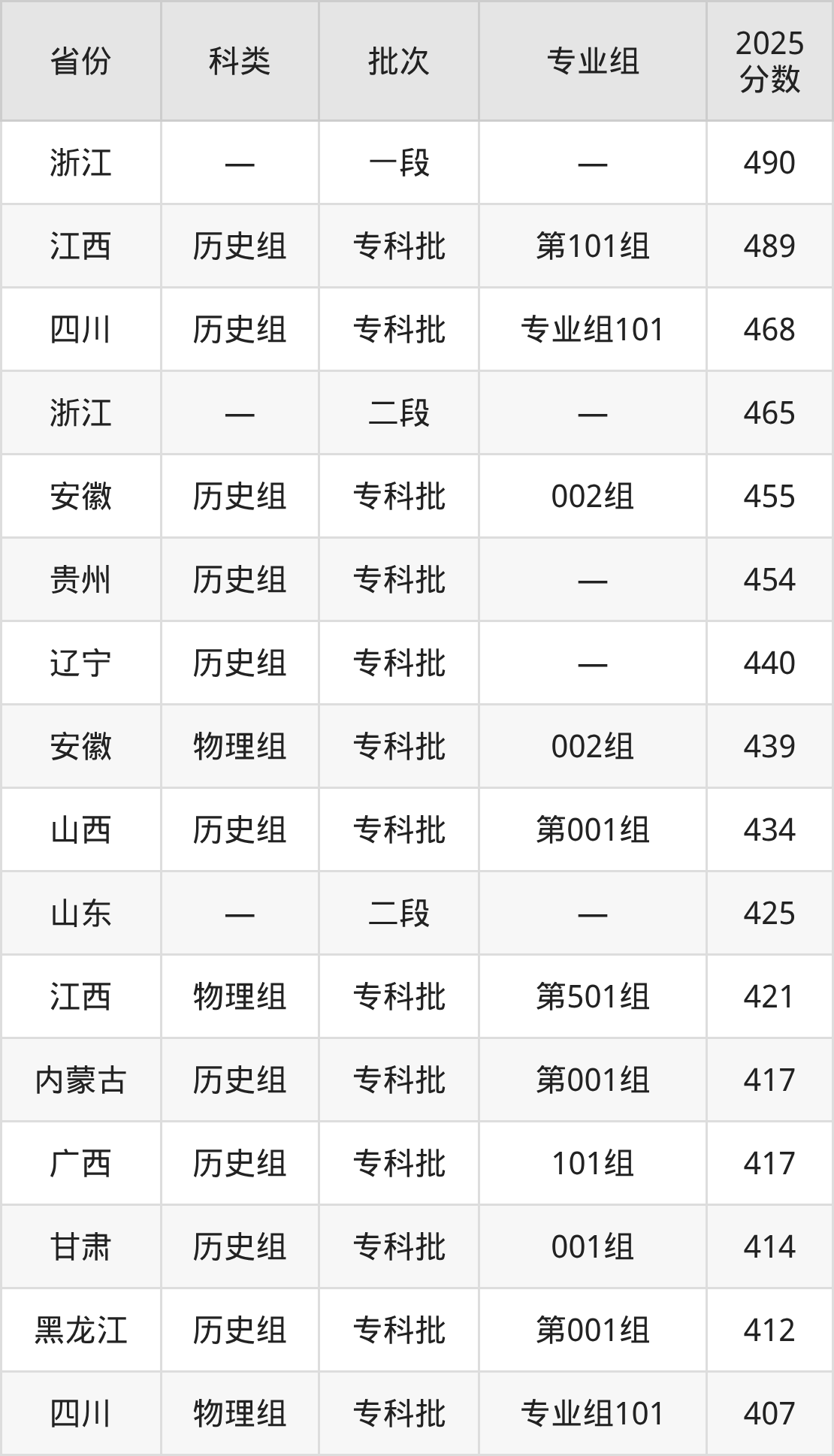 而浙江地区考生的分数门槛最高,2025年安徽中医药高等专科学校在浙江招生最低分为490分,考生至少要超一段线0分才有可能被录取。