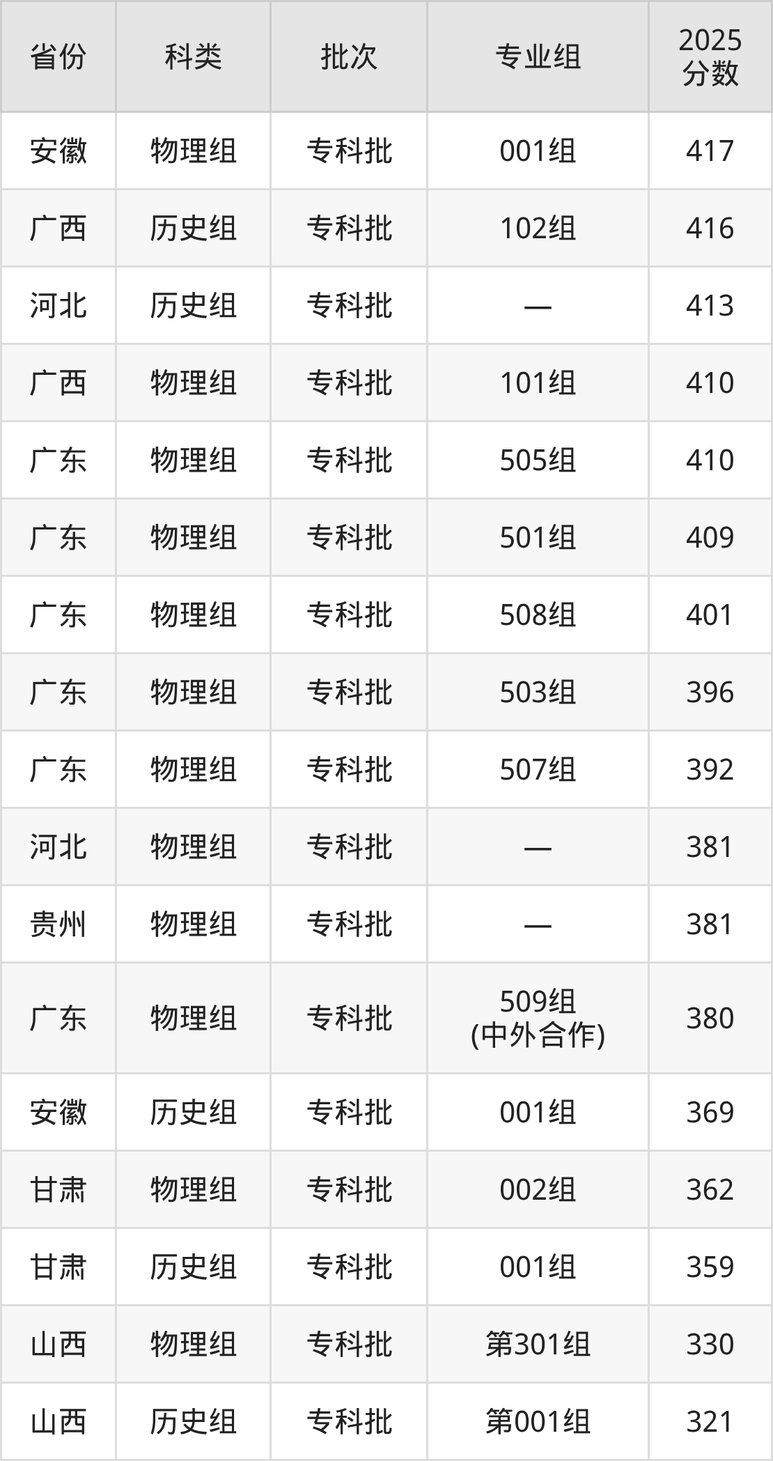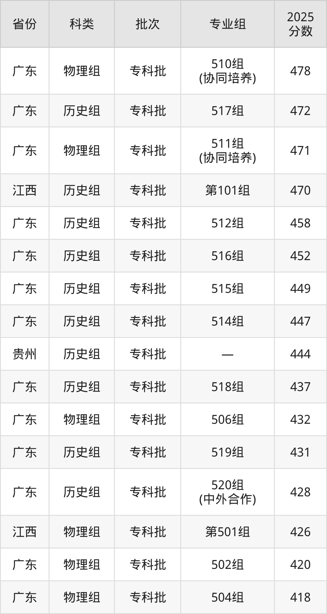 而江西地区历史组考生的分数门槛最高,2025年广东理工职业学院第101组在江西招生最低分为470分,考生至少要超专科线180分才有可能被录取。