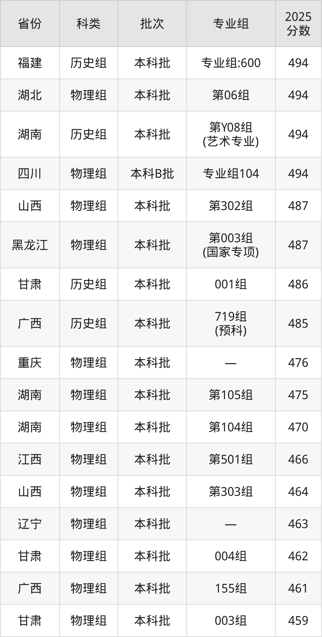 闽南师范大学在省内招生最低录取分数线为494分,在省外招生最低录取分数线为429分,不同地区、不同科类的考生最低分有差异。