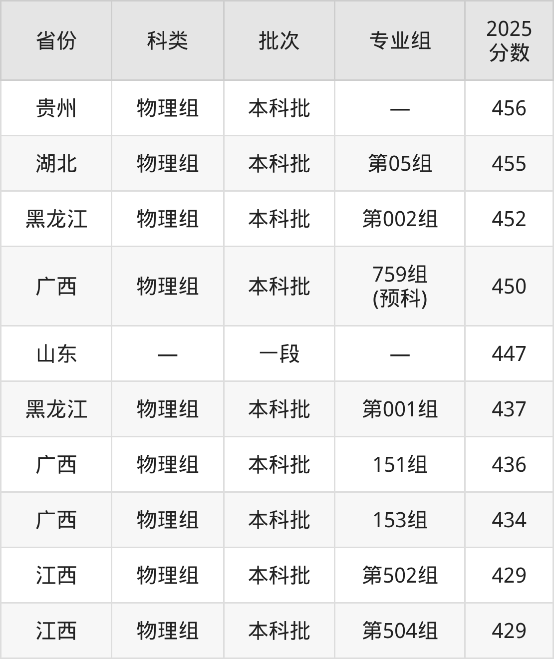 闽南师范大学在省外招生的最低分为429分,其中江西地区物理组考生上闽南师范大学的分数门槛最低,考生成绩达本科线即可报考。其次是广西物理组考生,上闽南师范大学至少要超本科线64分(434分)。
