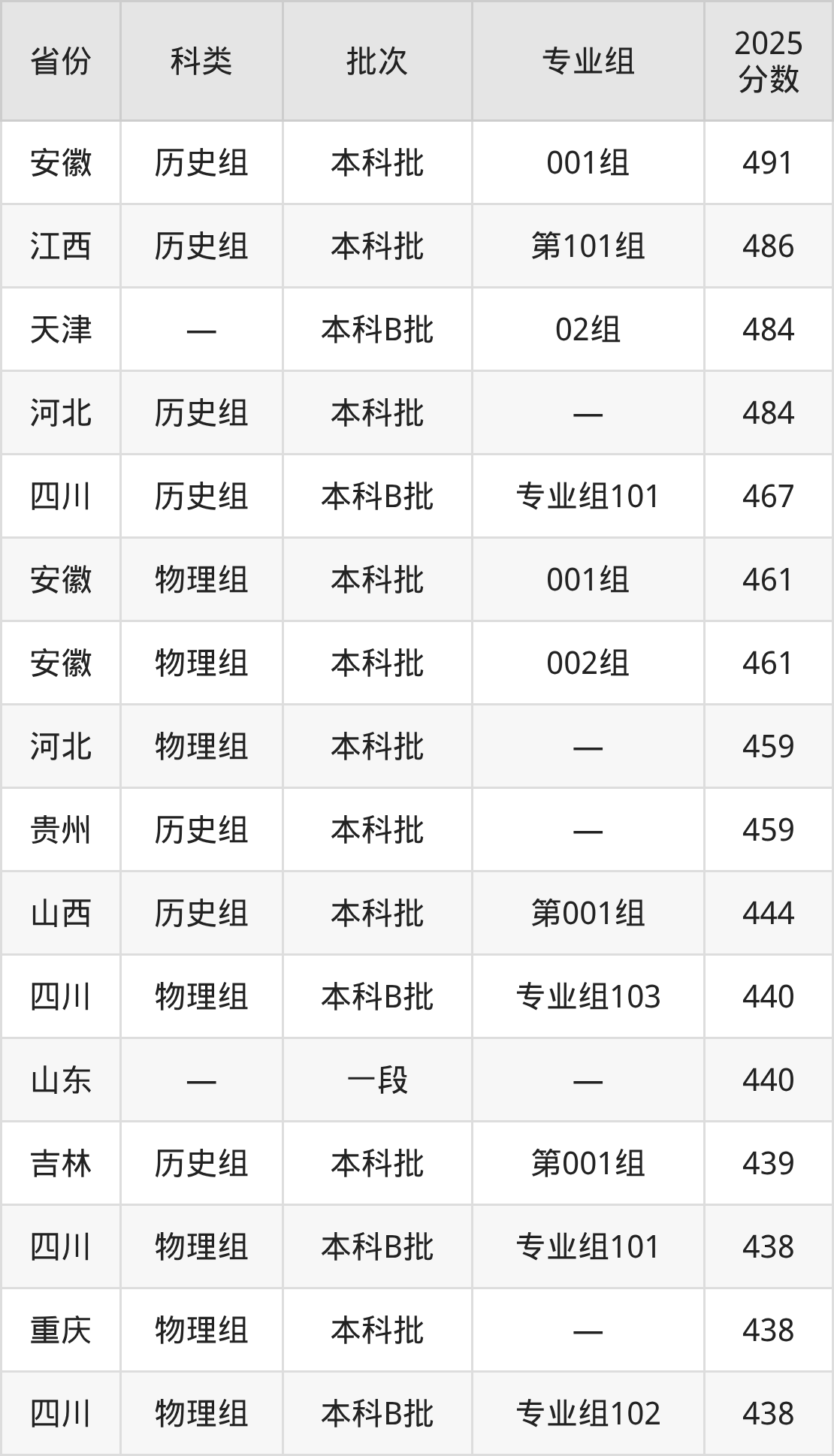 而安徽地区历史组考生的分数门槛最高,2025年齐齐哈尔工程学院001组在安徽招生最低分为491分,考生至少要超本科线14分才有可能被录取。