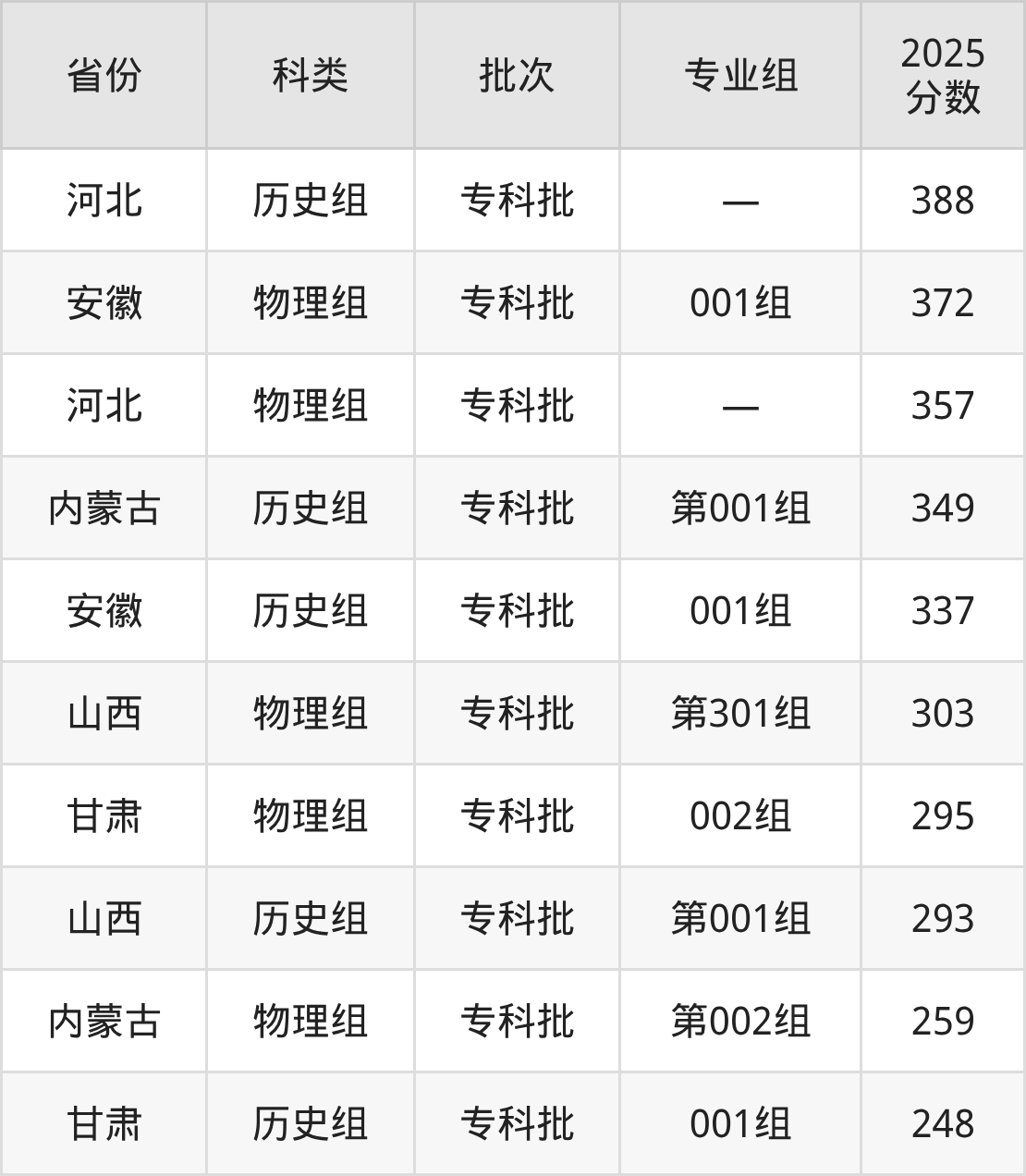 而安徽地区物理组考生的分数门槛最高,2025年河北劳动关系职业学院001组在安徽招生最低分为372分,考生至少要超专科线172分才有可能被录取。
