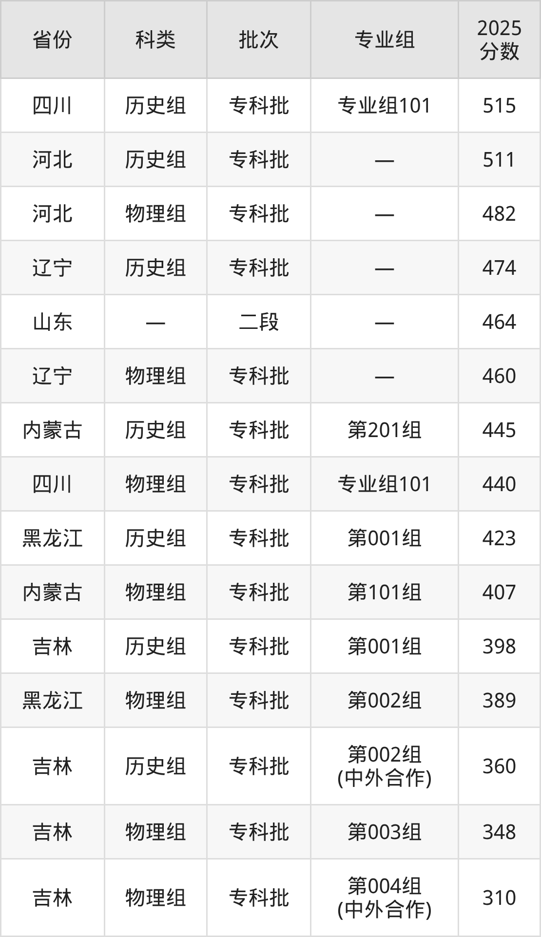 而四川地区历史组考生的分数门槛最高,2025年白城医学高等专科学校专业组101在四川招生最低分为515分,考生至少要超专科线365分才有可能被录取。