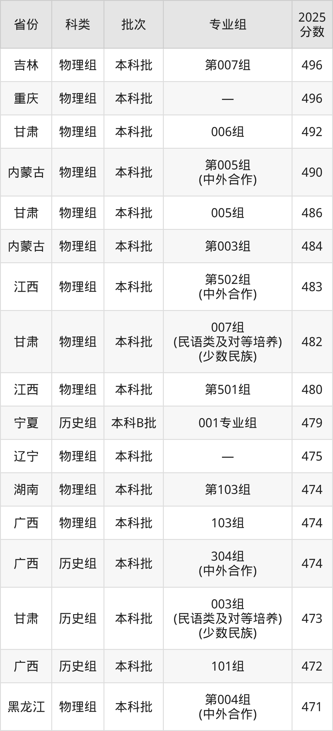 2025年吉林财经大学在全国普通批次招生的录取分数范围位于385~584分之间,其中省内分数范围为421分~535分,历史组最低分专业组为“第001组”,考生497分即可报考,物理组最低分专业组为“第004组”,考生421分即可报考。