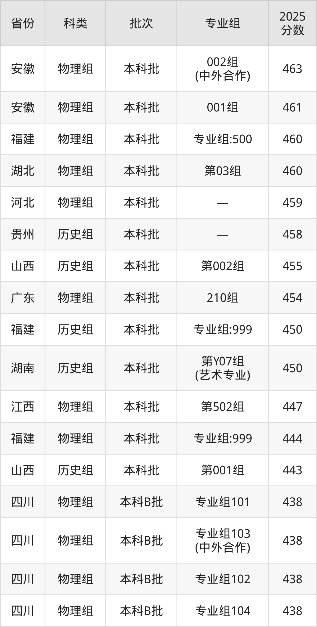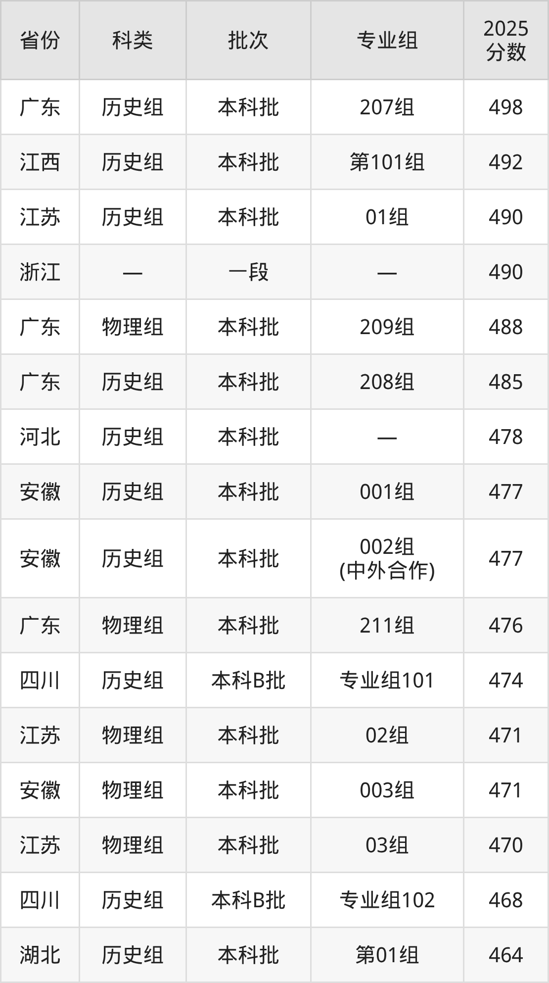 而广东地区历史组考生的分数门槛最高,2025年浙江越秀外国语学院207组在广东招生最低分为498分,考生至少要超本科线34分才有可能被录取。