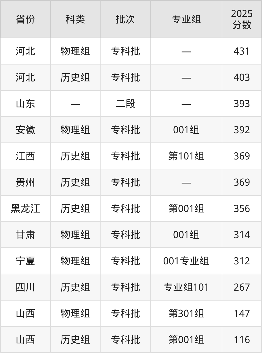 下面是山西老区职业技术学院2025年在全国各省的录取分数线一览表,供参考: