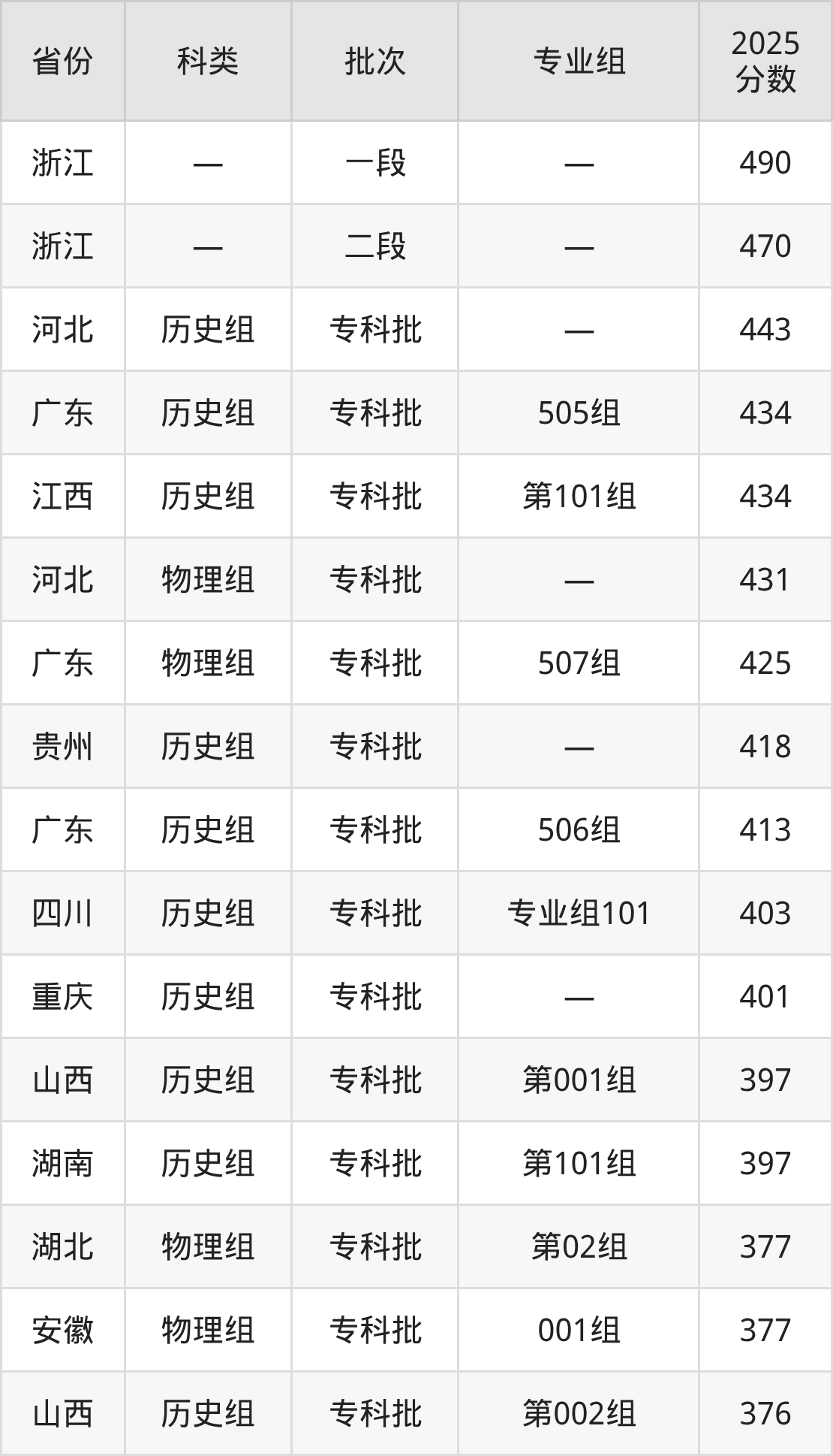 而浙江地区考生的分数门槛最高,2025年南昌健康职业技术学院在浙江招生最低分为490分,考生至少要超一段线0分才有可能被录取。