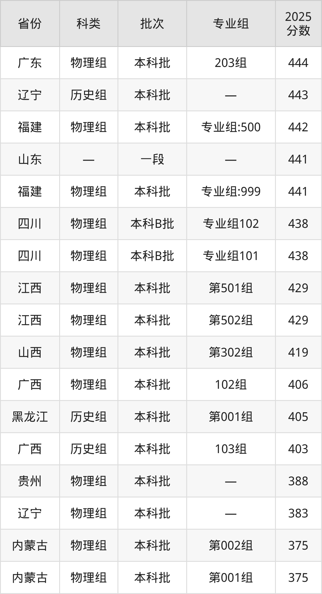 2025年黑龙江东方学院在全国普通批次招生的录取分数范围位于344~491分之间,其中省内分数范围为360分~405分,历史组最低分专业组为“第001组”,考生405分即可报考,物理组最低分专业组为“第003组”,考生360分即可报考。