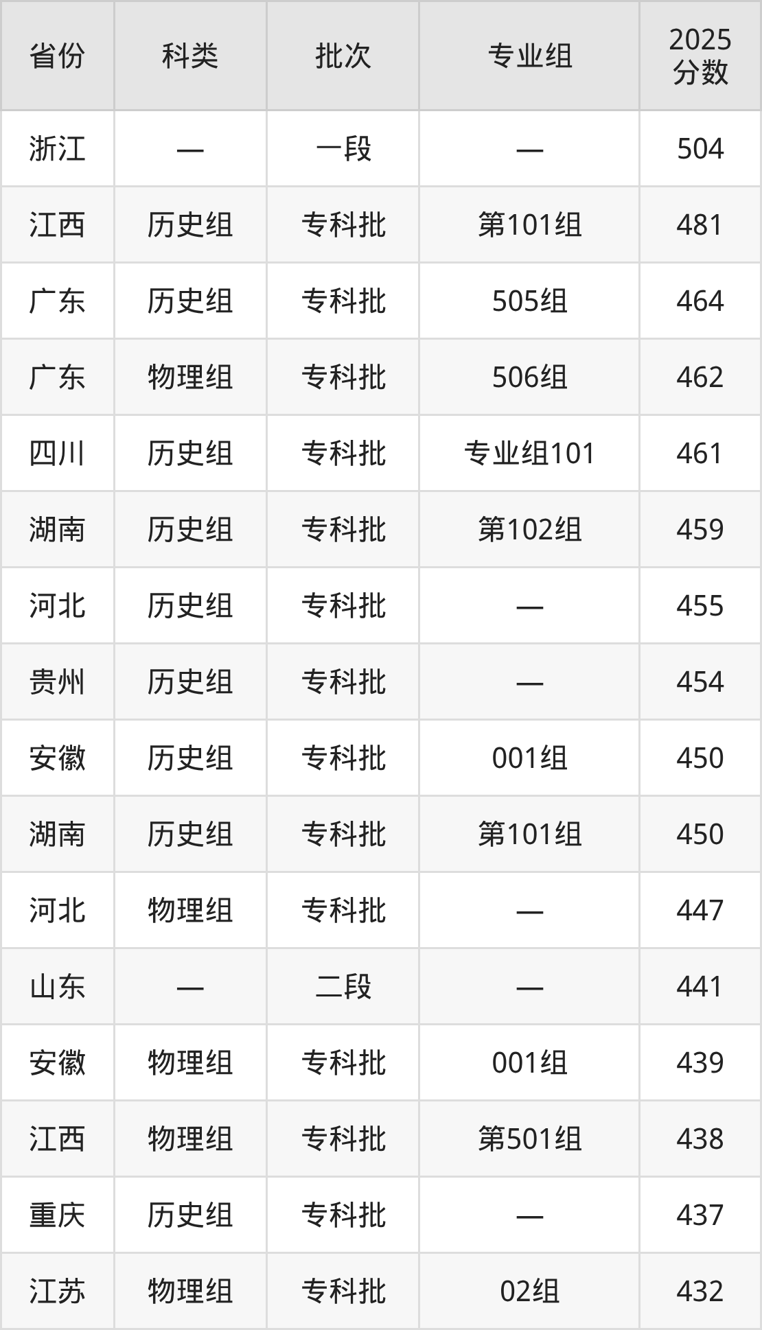 而浙江地区考生的分数门槛最高,2025年湖南大众传媒职业技术学院在浙江招生最低分为504分,考生至少要超一段线14分才有可能被录取。