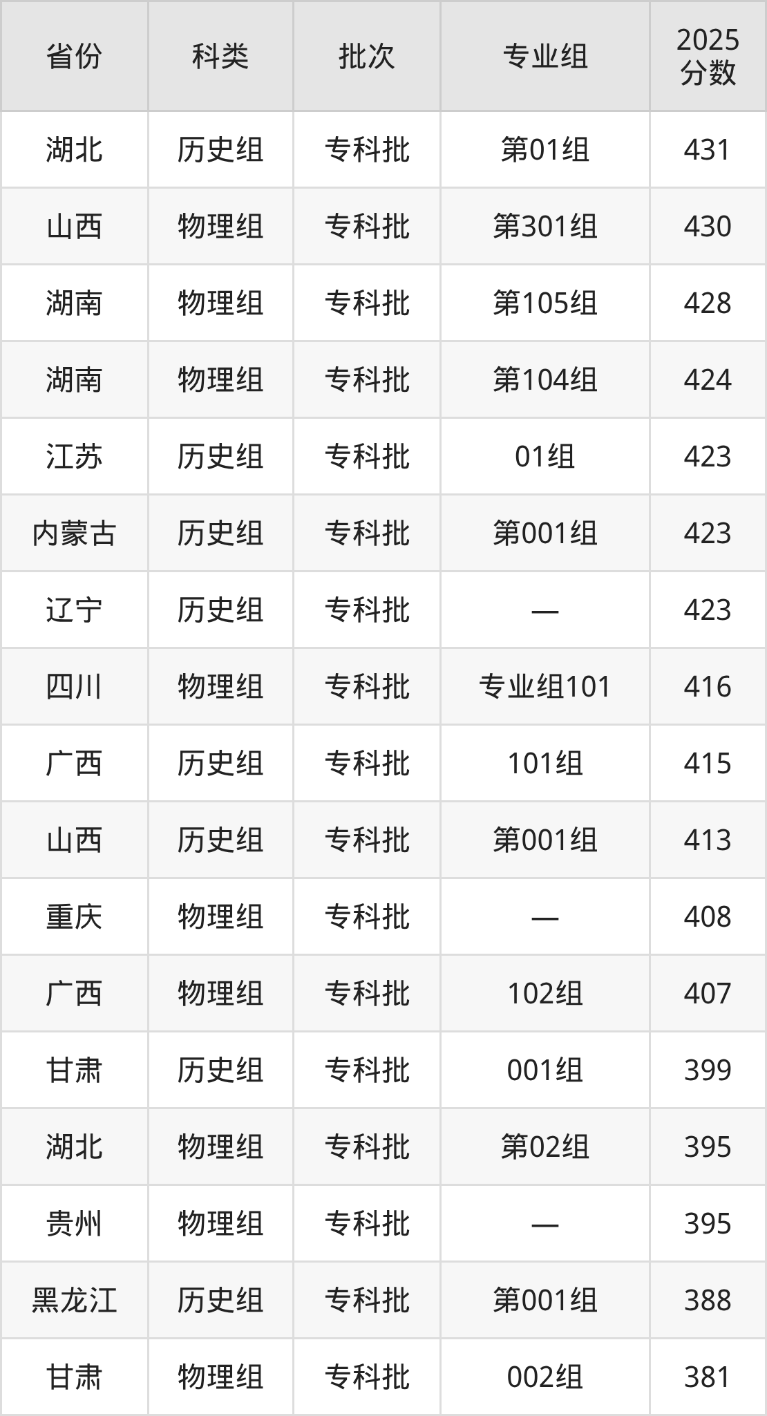 下面是湖南大众传媒职业技术学院2025年在全国各省的录取分数线一览表,供参考: