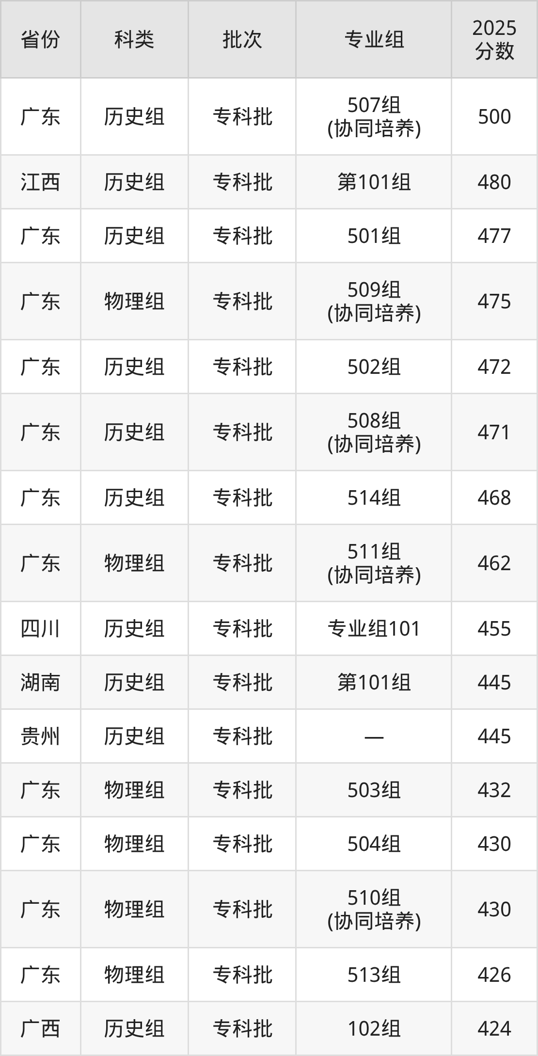 目前能查询到的最新分数为2025年招录数据,2026年广州城市职业学院录取分数线会在高考招录结束后公布,本届考生可以利用往年分数预估录取概率。