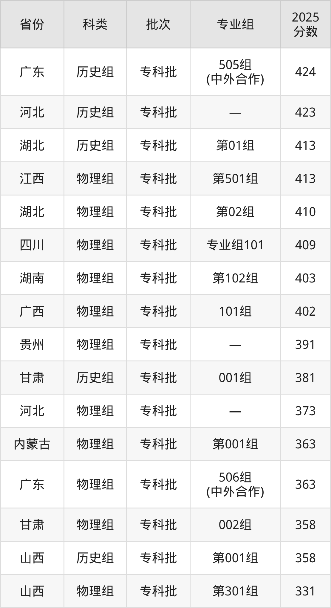 2025年广州城市职业学院在全国普通批次招生的录取分数范围位于331~500分之间,其中省内分数范围为363分~500分,历史组最低分专业组为“505组(中外合作)”,考生424分即可报考,物理组最低分专业组为“506组(中外合作)”,考生363分即可报考。
