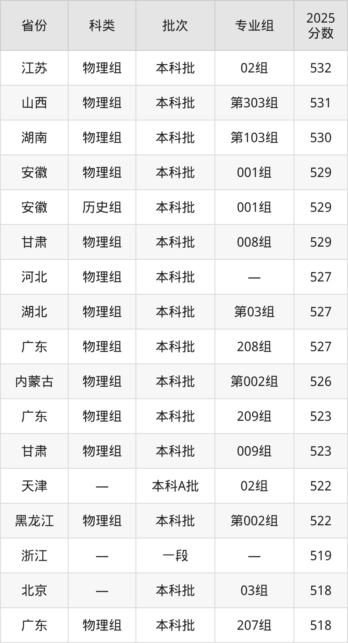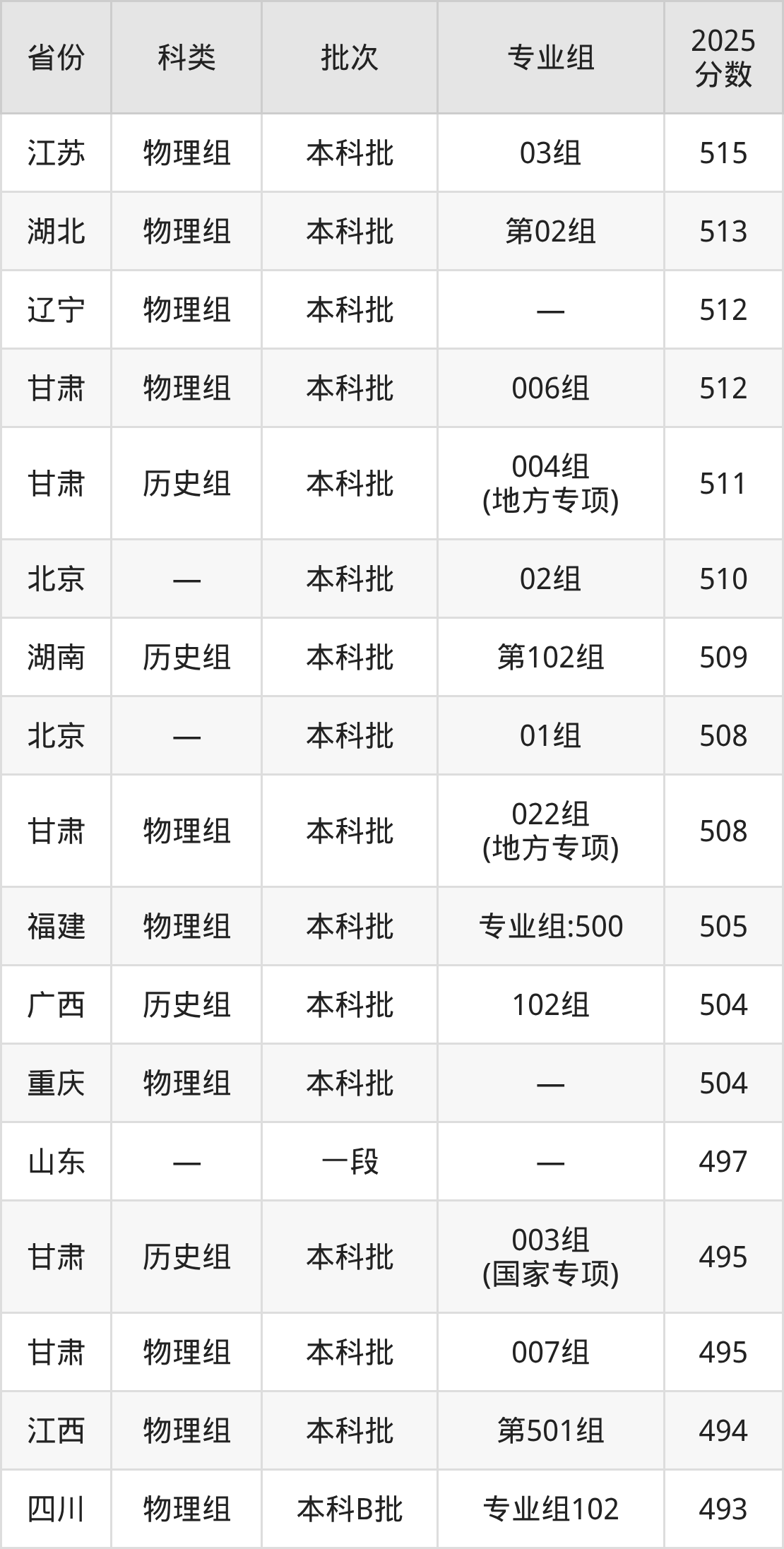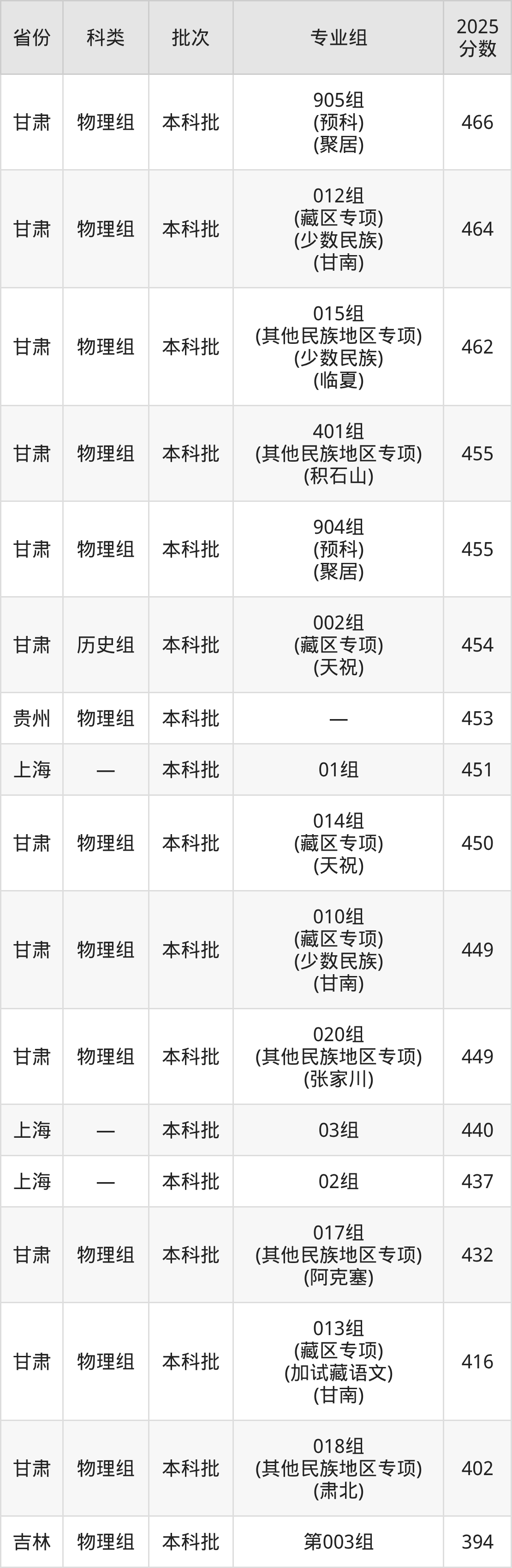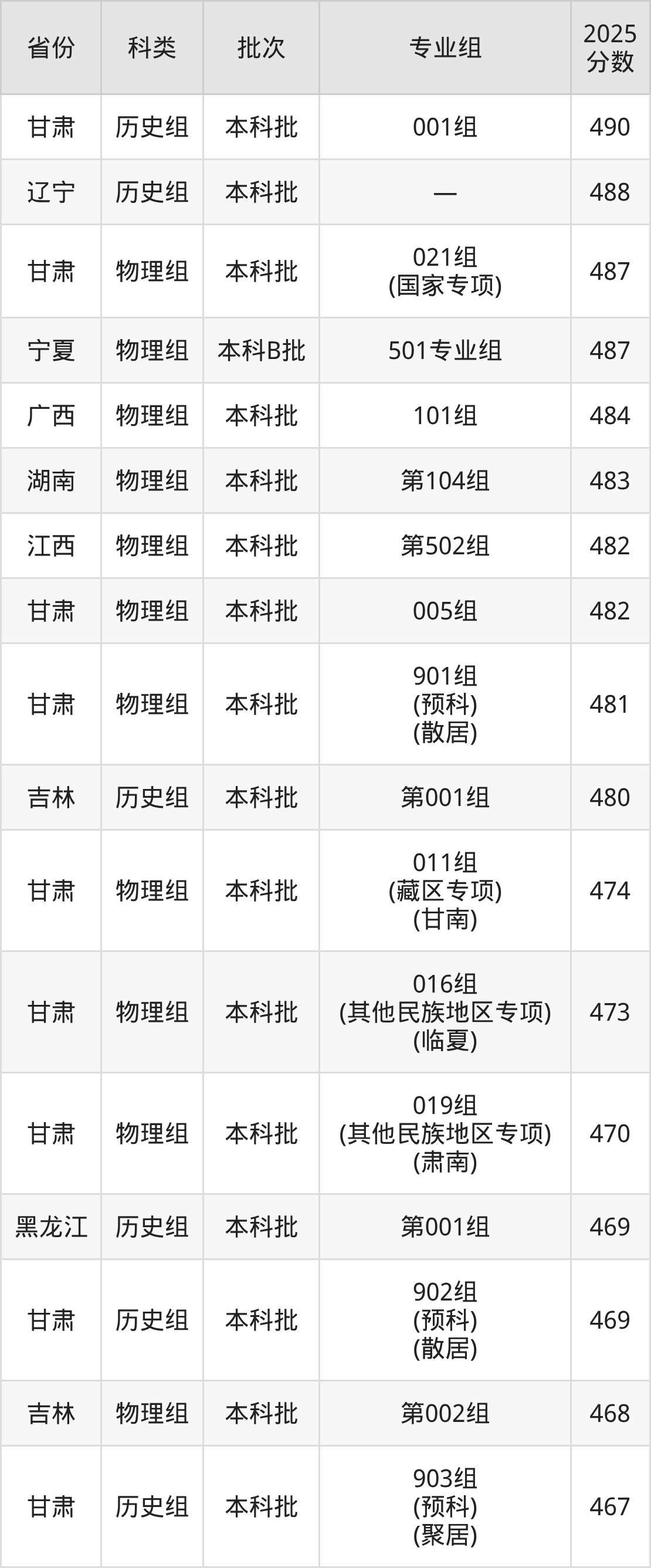 2025年兰州理工大学在全国普通批次招生的录取分数范围位于374~601分之间,其中省内分数范围为402分~529分,物理组最低分专业组为“018组(其他民族地区专项)(肃北)”,考生402分即可报考,历史组最低分专业组为“002组(藏区专项)(天祝)”,考生454分即可报考。