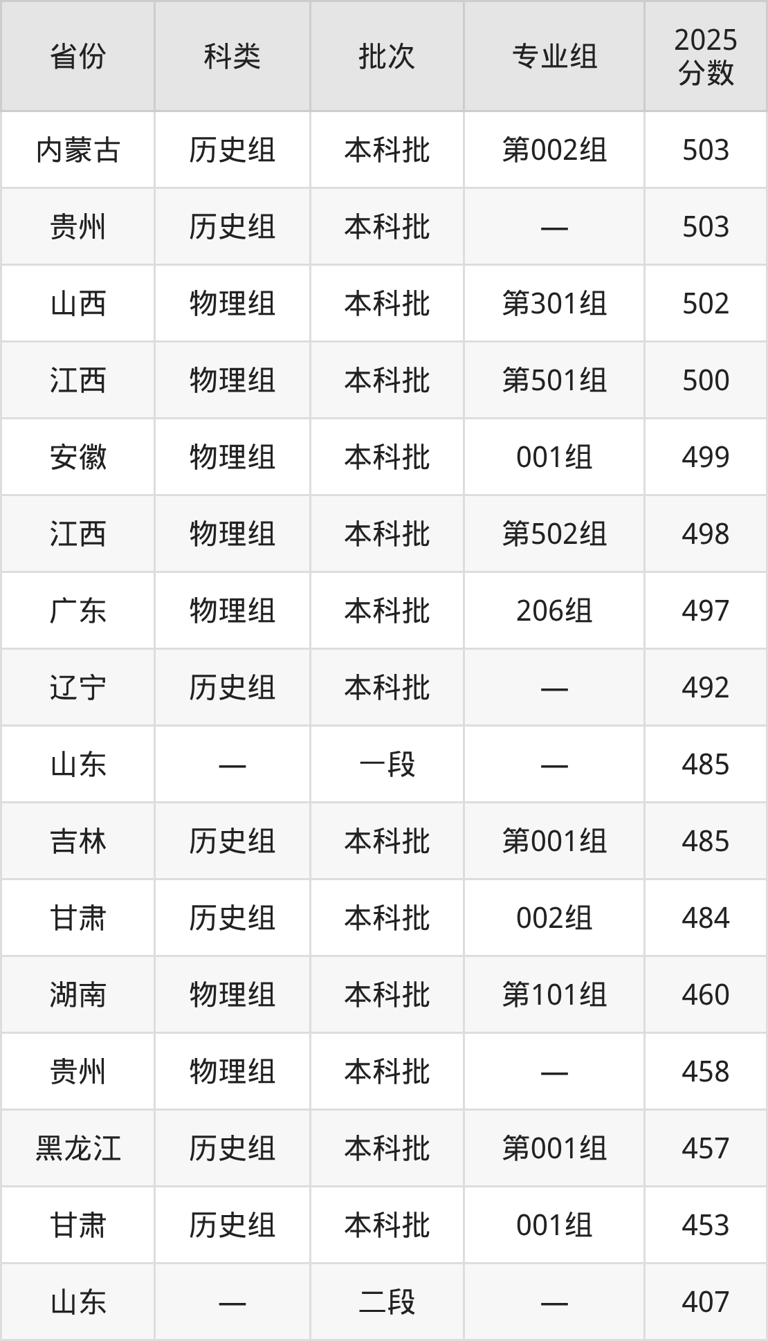 下面是山东青年政治学院2025年在全国各省的录取分数线一览表,供参考: